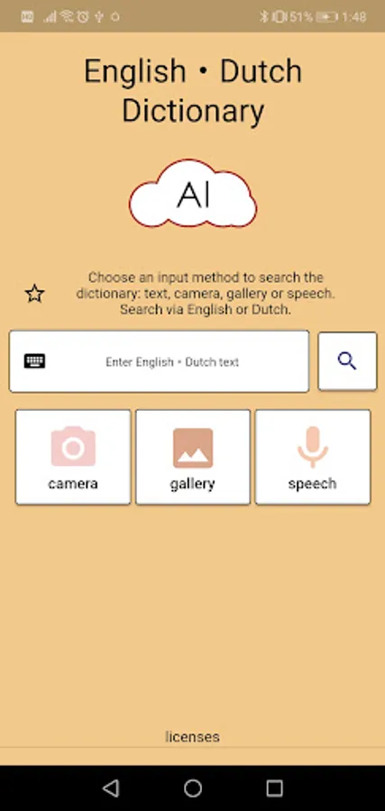 The AI dictionary will recognize speech allowing you to search the dictionary by speaking into the microphone in both English and Dutch.