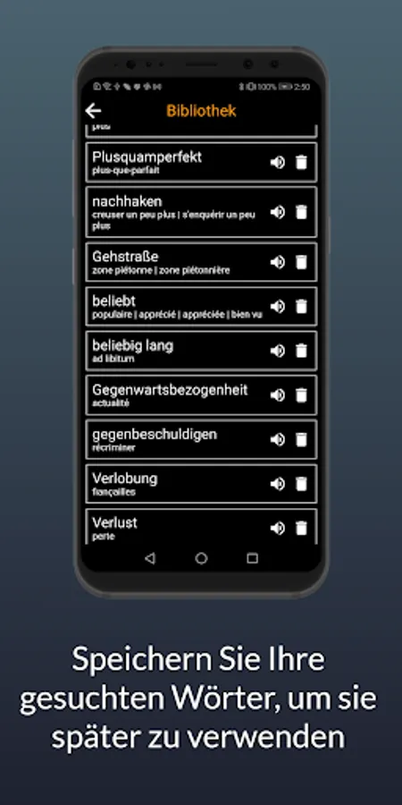 The AI dictionary recognizes speech, so you can search the dictionary by speaking into the microphone in both German and French.