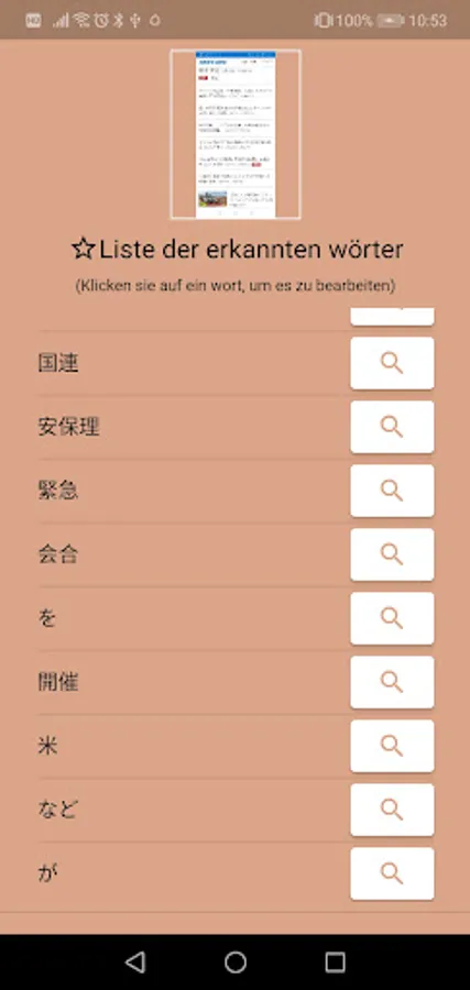 Das KI-Wörterbuch erkennt deutschen und japanischen Text in Bildern aus der Kamera oder Fotogalerie, sodass Benutzer schnell und effizient mehrere Wörter nachschlagen können.