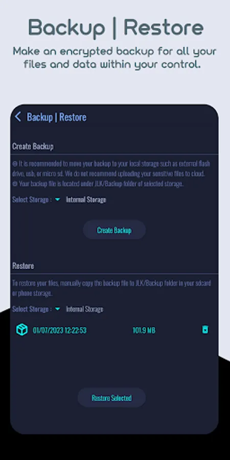 Create backup, save it in your own personal storage and restore your files anytime you needed. Only in premium version.