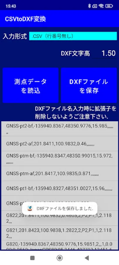 In this conversion app, it is saved in DXF format as a character string representing the station name and a point figure representing the position.