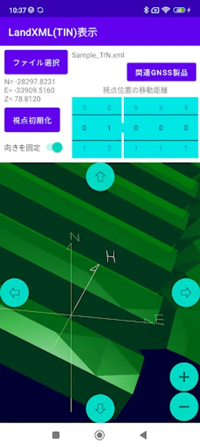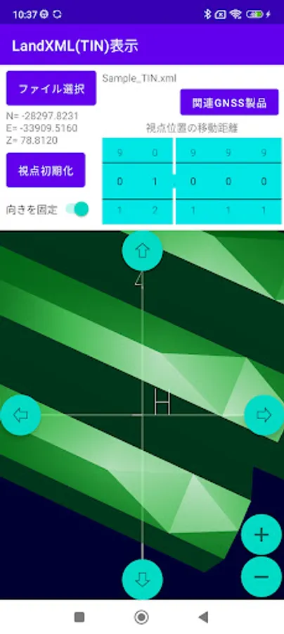 You can read the terrain model saved in LandXML format and display it on the screen, display the data from a free viewpoint, and check the 3D coordinates of the point being displayed.