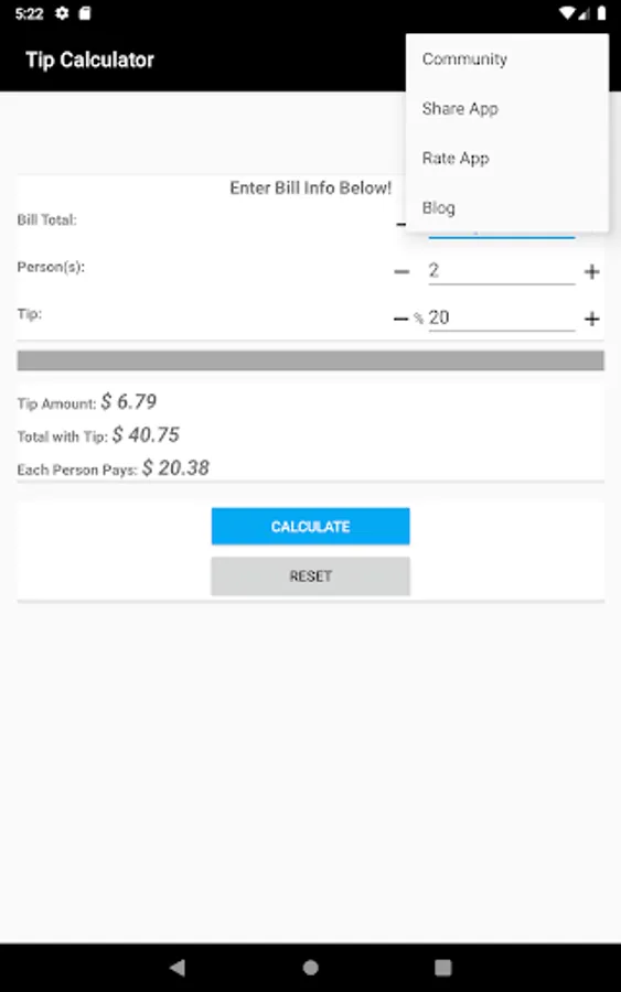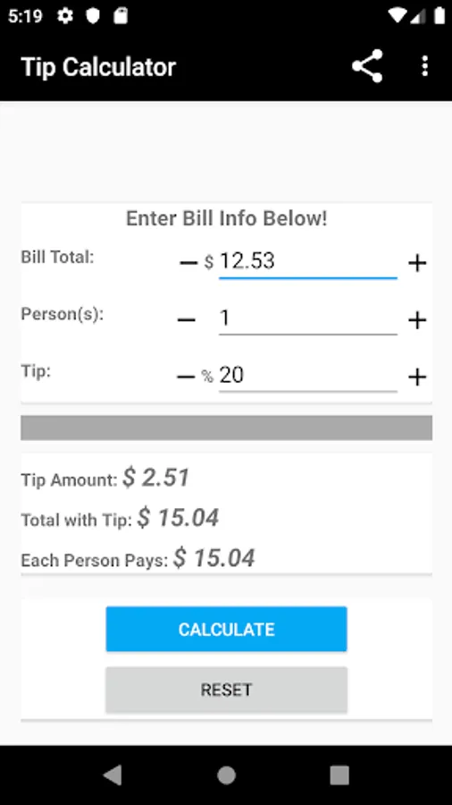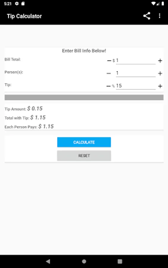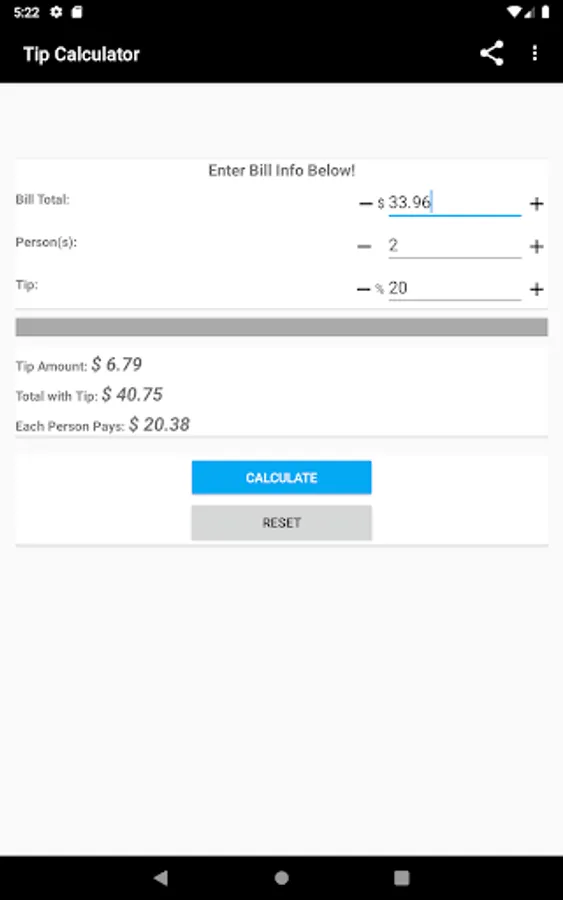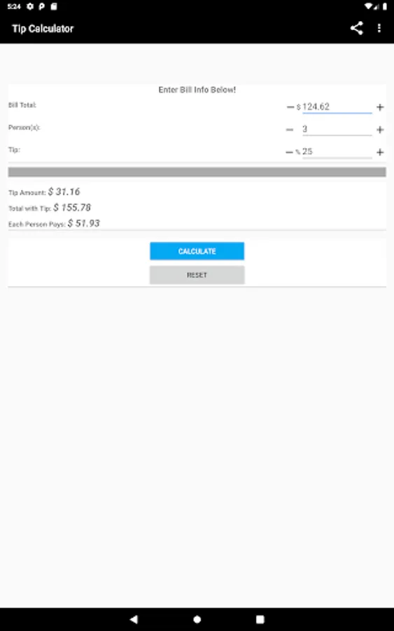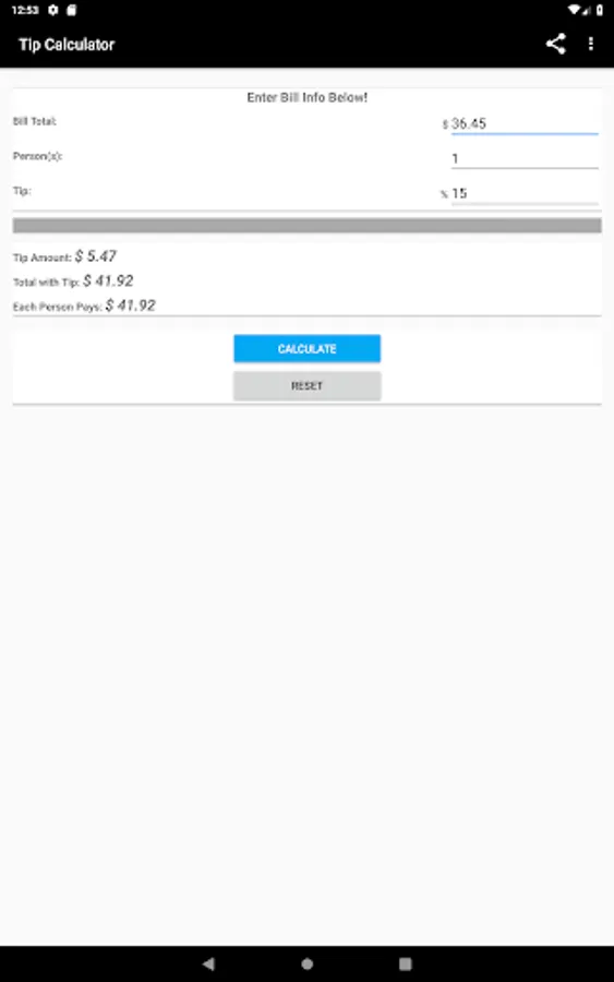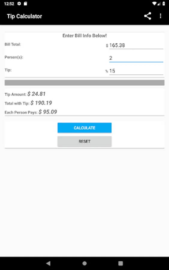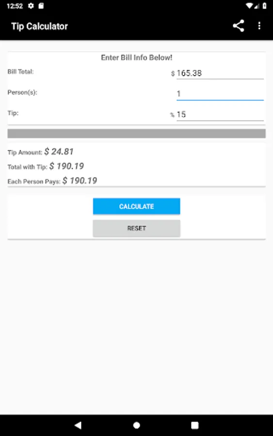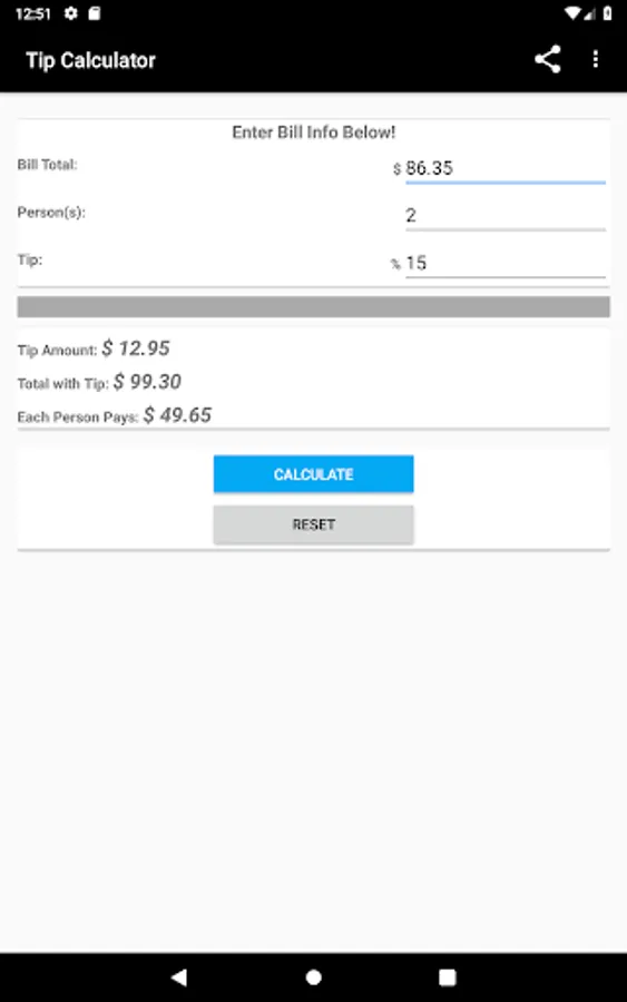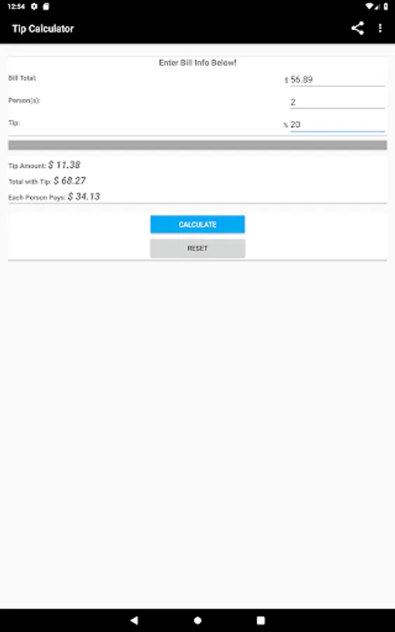 With a Tip Calculator easily get gratuity amount to be paid, the total of the bill and if party of two or greater can split the bill amount.