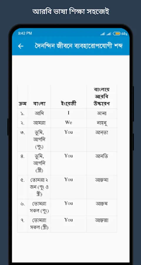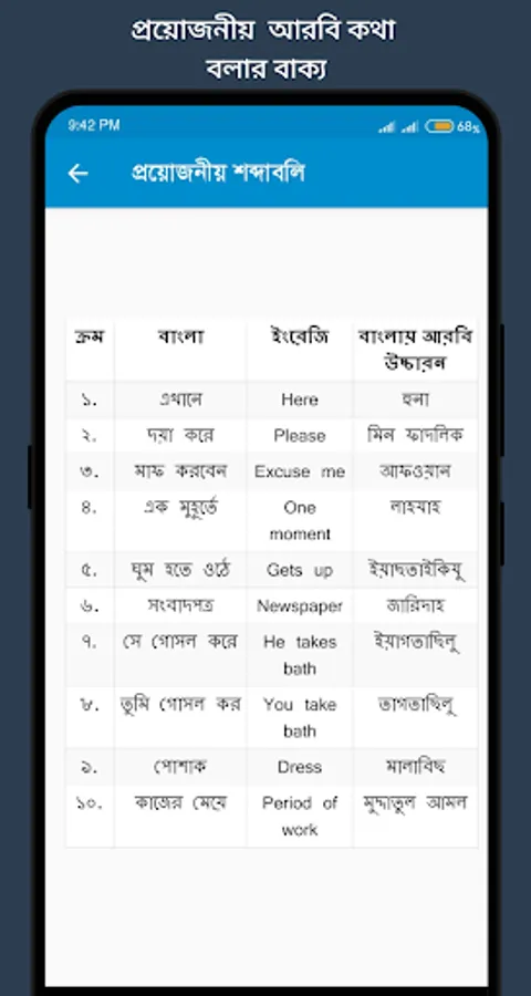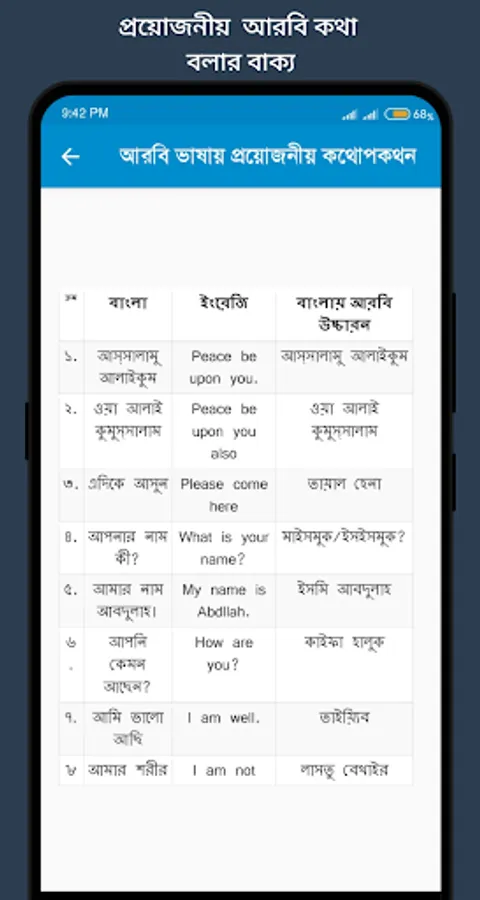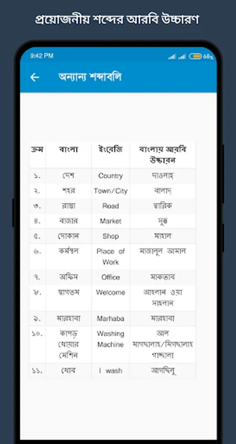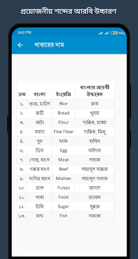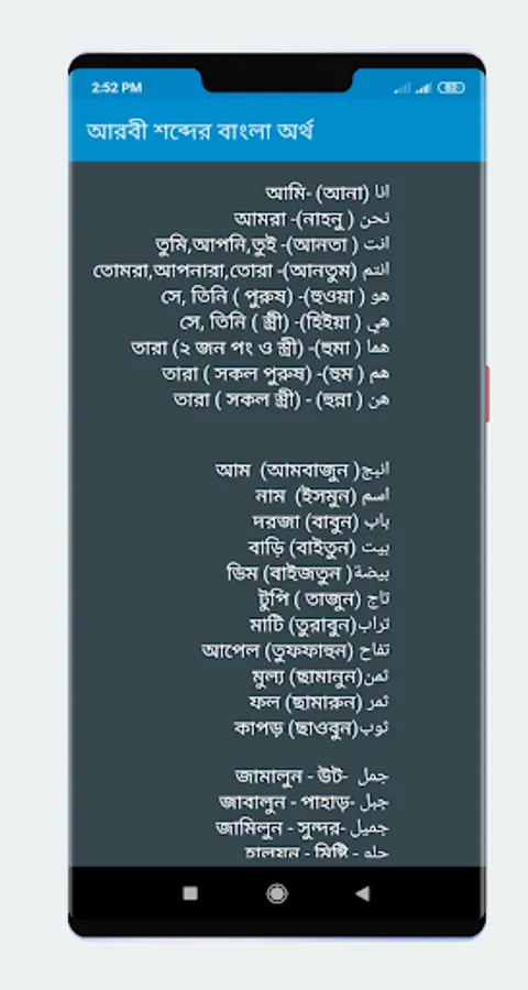 Easily here you will find the meaning of Arabic words in Bengali language. For learning Arabic language in Bengali, this app will help you. This app has many chapters where you can translate Arabic words to Bengali words. Arabic words with Bengali meanings are inserted in the app. It can be said that this is an Arabic vocabulary app. It is an important app for learning Arabic language because Arabic words have meanings in Bengali and pronunciation.