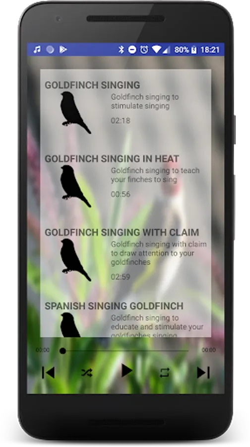 Singing goldfinches is an application that will help you with different songs to teach, educate or motivate your finch to sing nice and clear, this application has different songs of goldfinches that you put near your goldfinch and put infinitely for your canary will listen and take example.