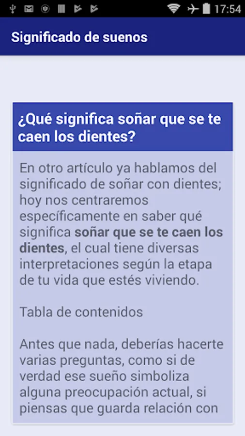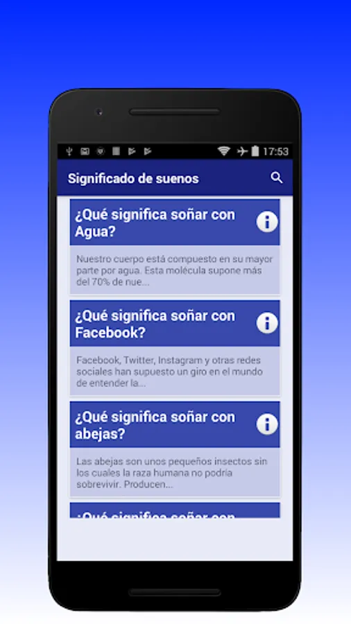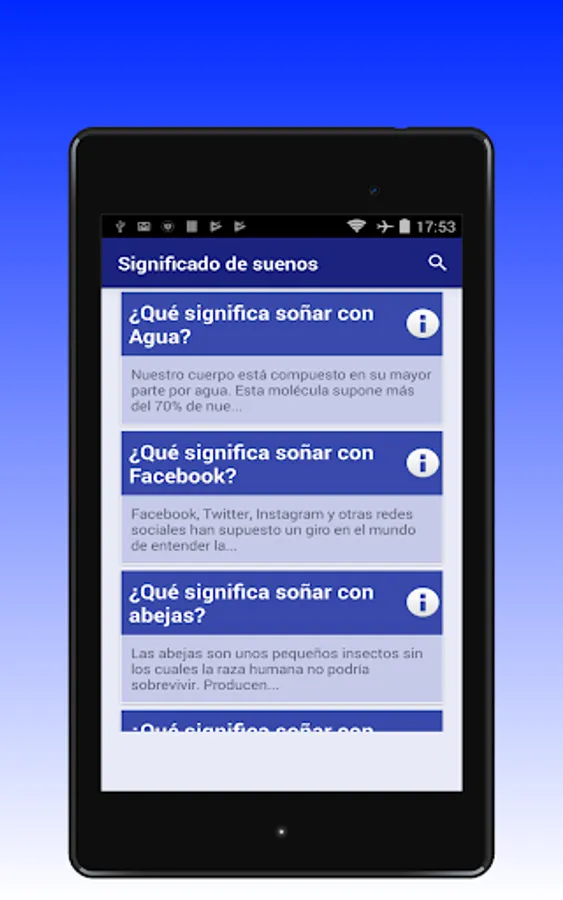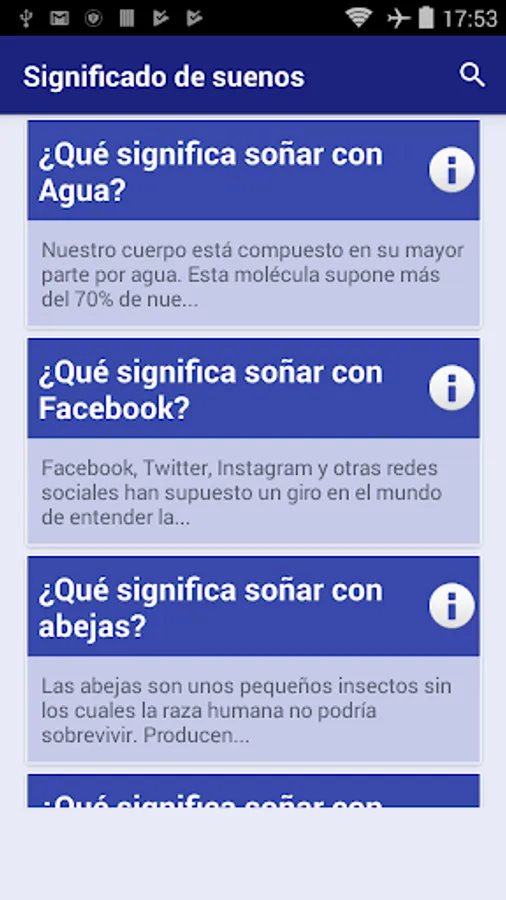 This application is a book of meaning of dreams and lucid dreams with their meanings in Spanish and has a multitude of dreams , you will see a list with all the meaning of dreams for free and in Spanish and lucid dreams. Find your dream and access the description to inform yourself or the people around you what the dreams mean.
