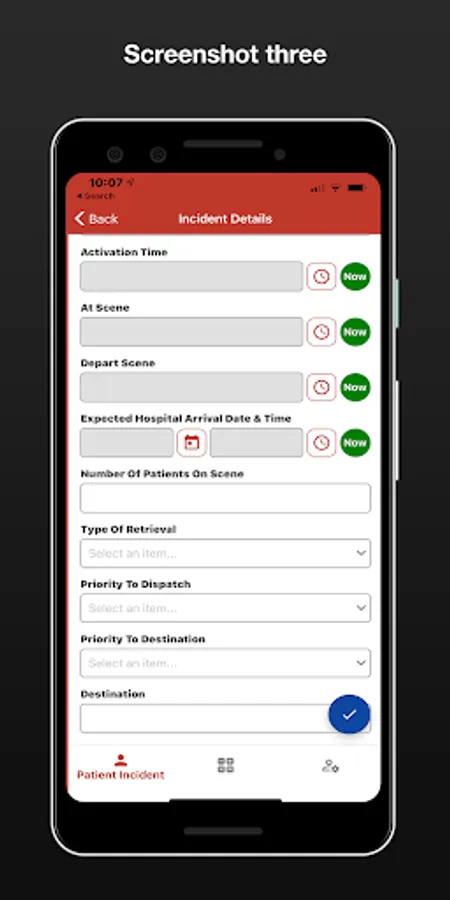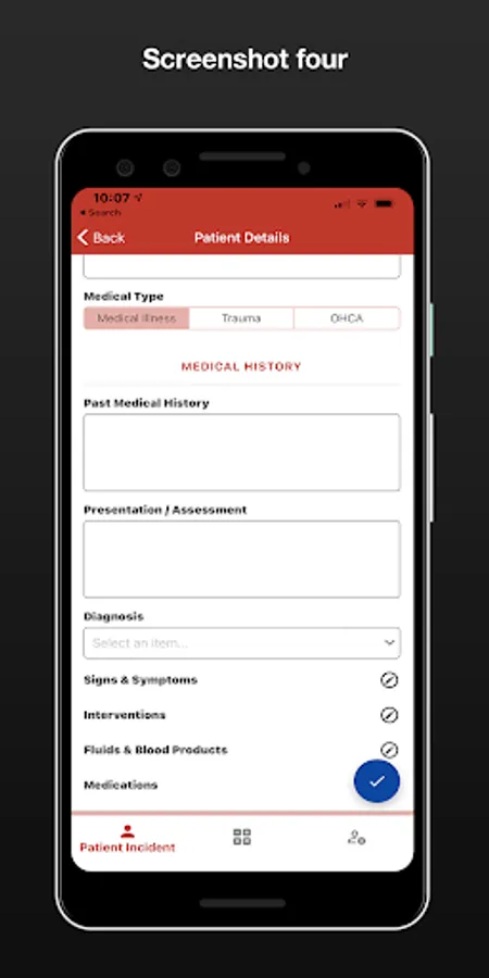 The app assists pre-hospital documentation that produces a complete legible pre-hospital record with instantaneous access to the data. The app captures patient details, and assessment including vital signs and injuries captured during the event flow through to the hospitals through webpage solution, thus providing early and effective management of patients and decreasing mortality and morbidity.