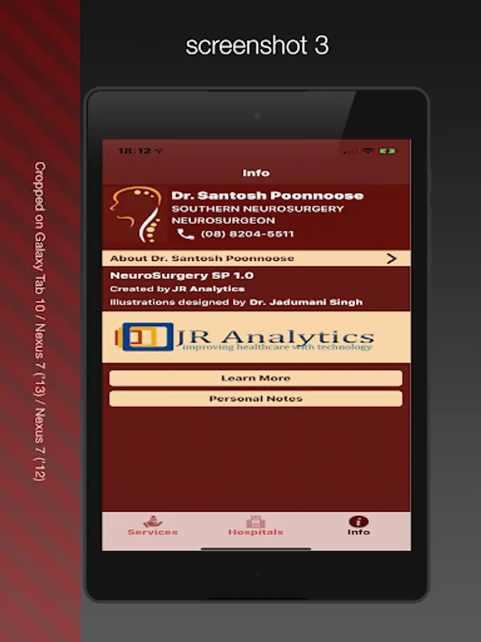The content and descriptions of NeuroSurgery SP app are solely owned by Dr Santosh Poonnoose and has been replicated from the website with his permission. The illustrations accompanied in the app have been designed and drawn by Dr Jadumani Singh, Director of JRAnalytics. NeuroSurgery SP app is designed, edited and developed by JR Analytics team, and is the sole property of JR Analytics. For more information about Dr Santosh Poonnoose go to http://www.neurosurgeonadelaide.com.au/dr-santosh-isaac-poonnoose.html