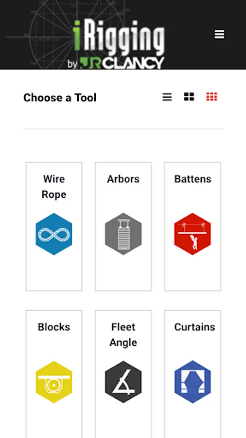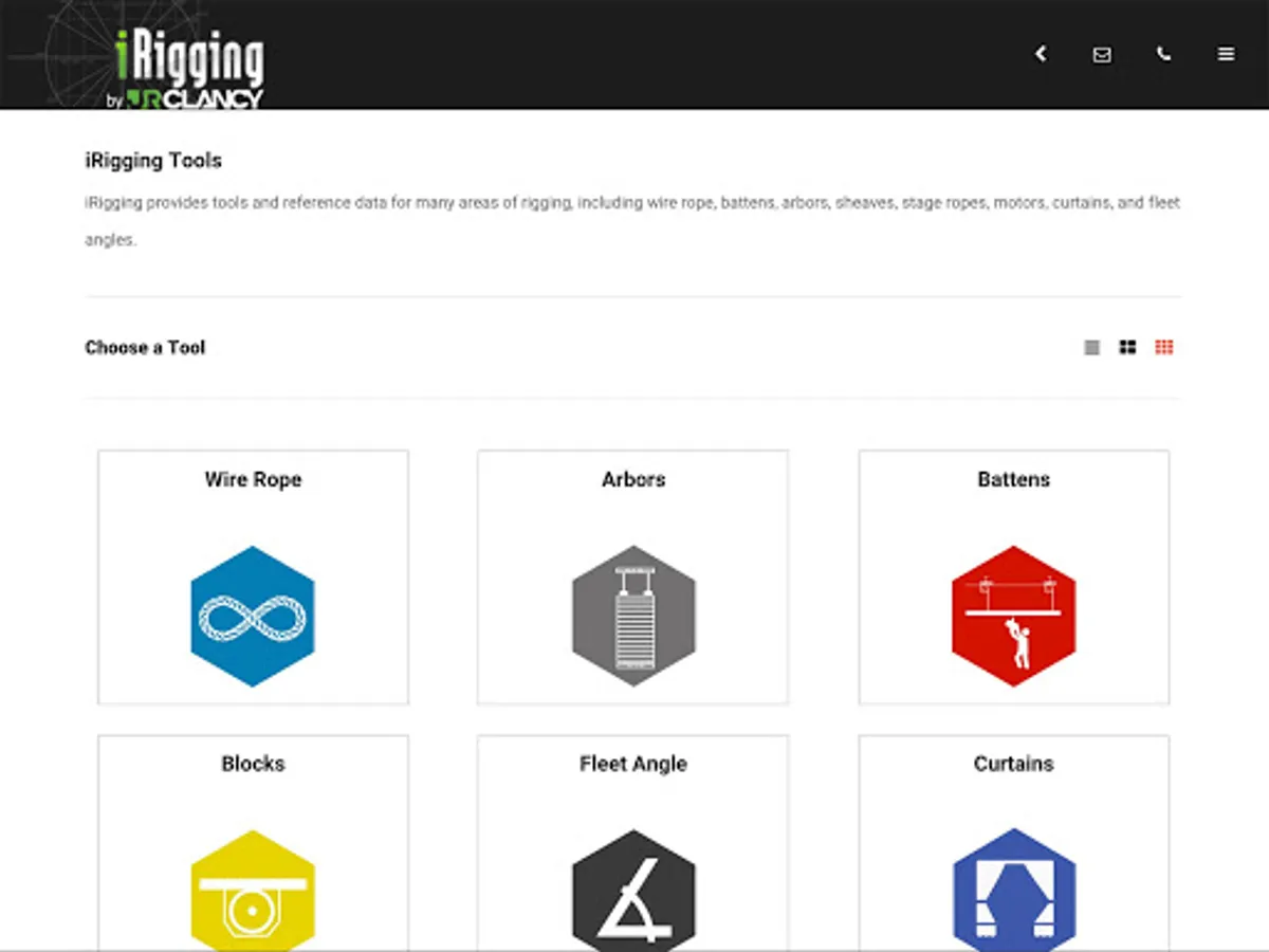 iRigging Tools provides tools and reference data for many areas of rigging, including wire rope, battens, arbors, sheaves, stage ropes, motors, curtains, and fleet angles.