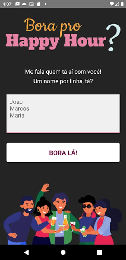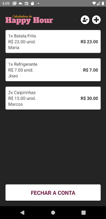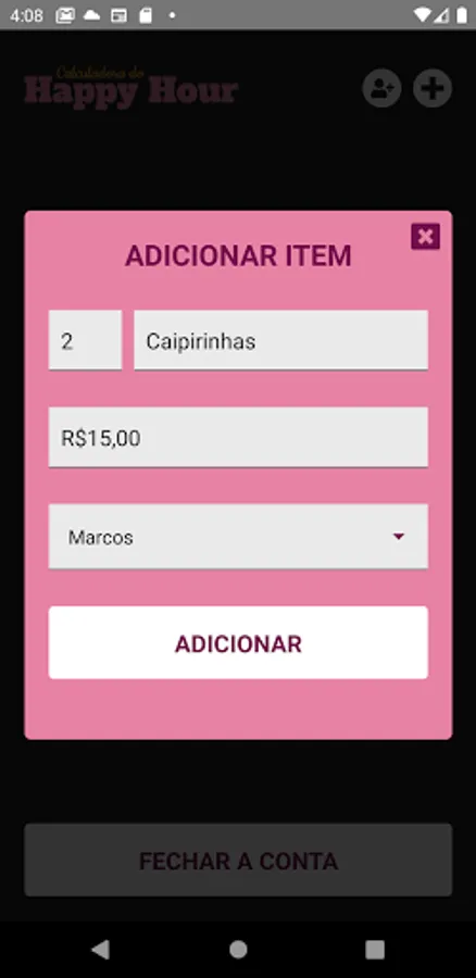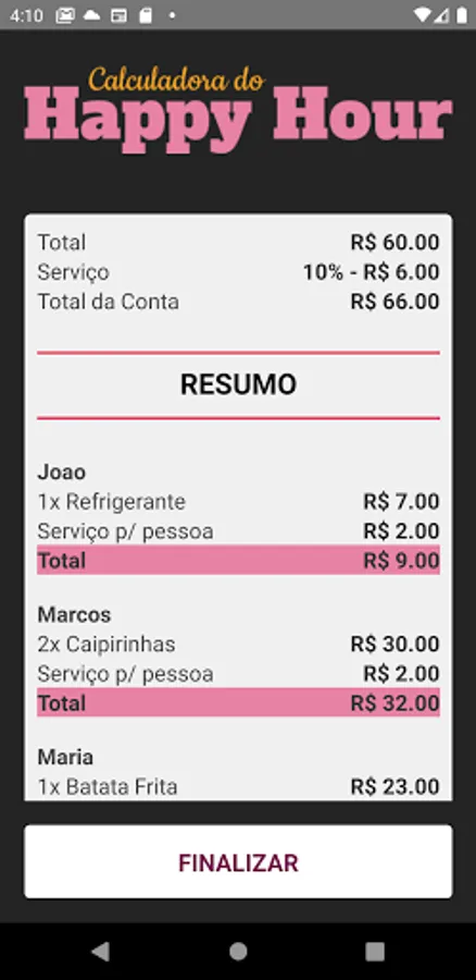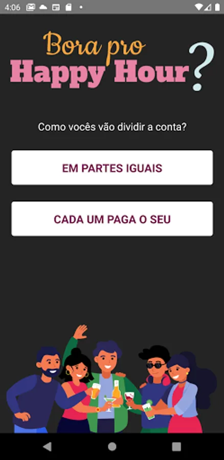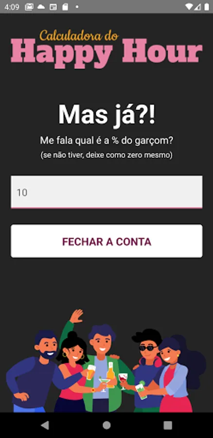 Happy Hour Calculator is an app to help you and your friends control spending at happy hour! You can select how you are going to divide the bill (equally or individually) and also the percentage of the waiter. Then the app still shows you a summary of everything that was spent, how much each one will pay and the total bill.
