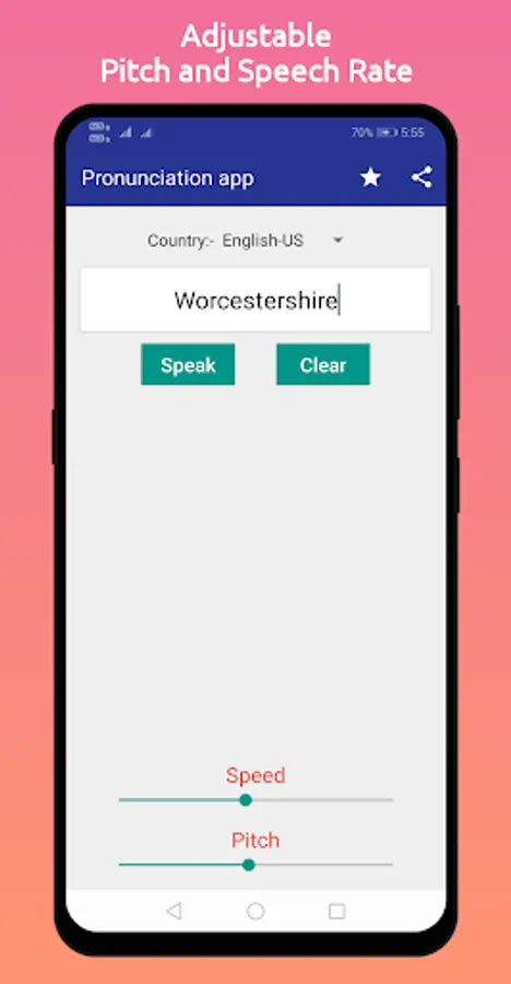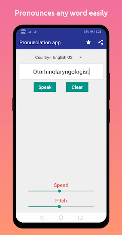 English Pronunciation app helps you to pronounce difficult words like Otorhinolaryngologist, Worchestire, Quinoa etc. In this app you can adjust Speech Rate and Pitch of the Voice . This app works in Offline mode.