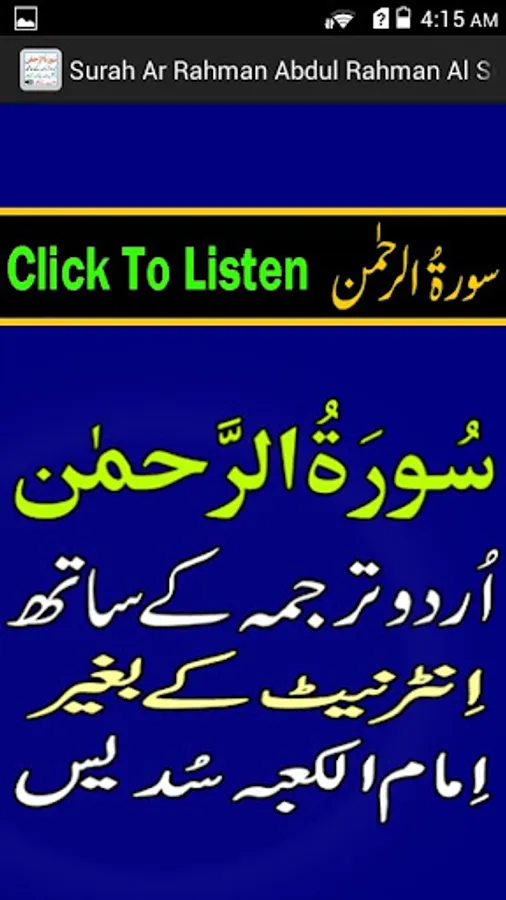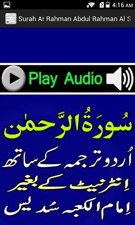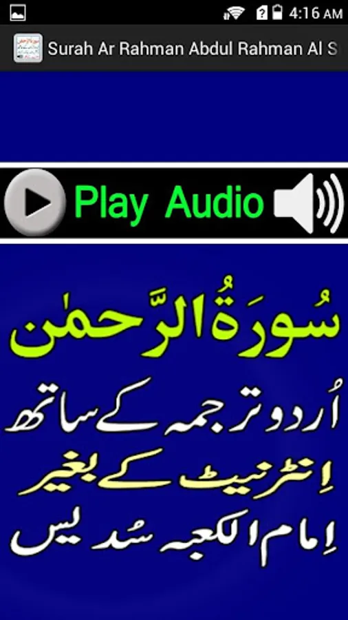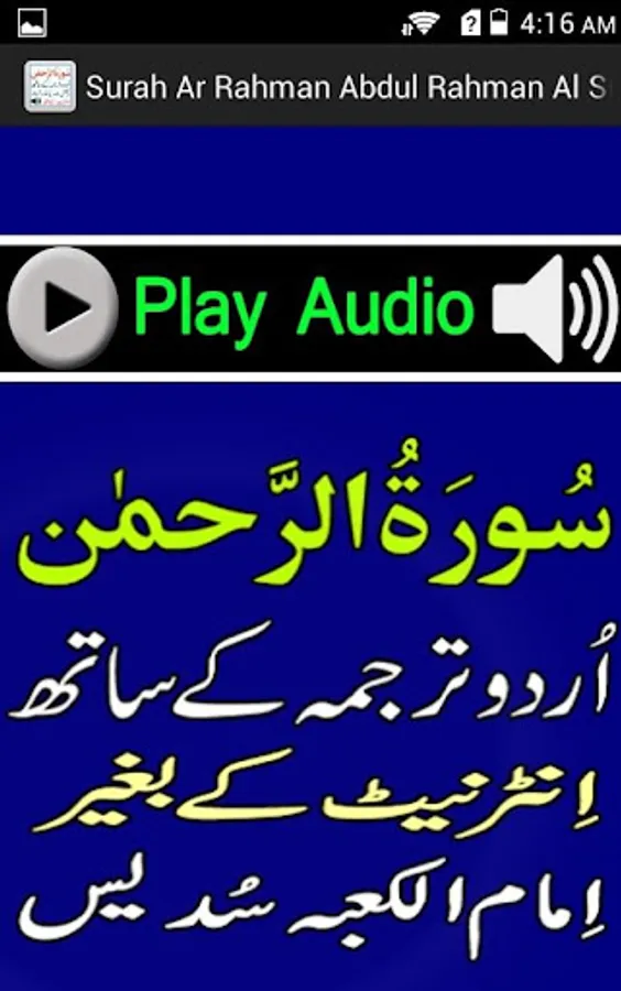 This is the best app of Surah Rahman with urdu tarjumah in Sudaes Voice which play Audio Mp3 Tilawat without internet.