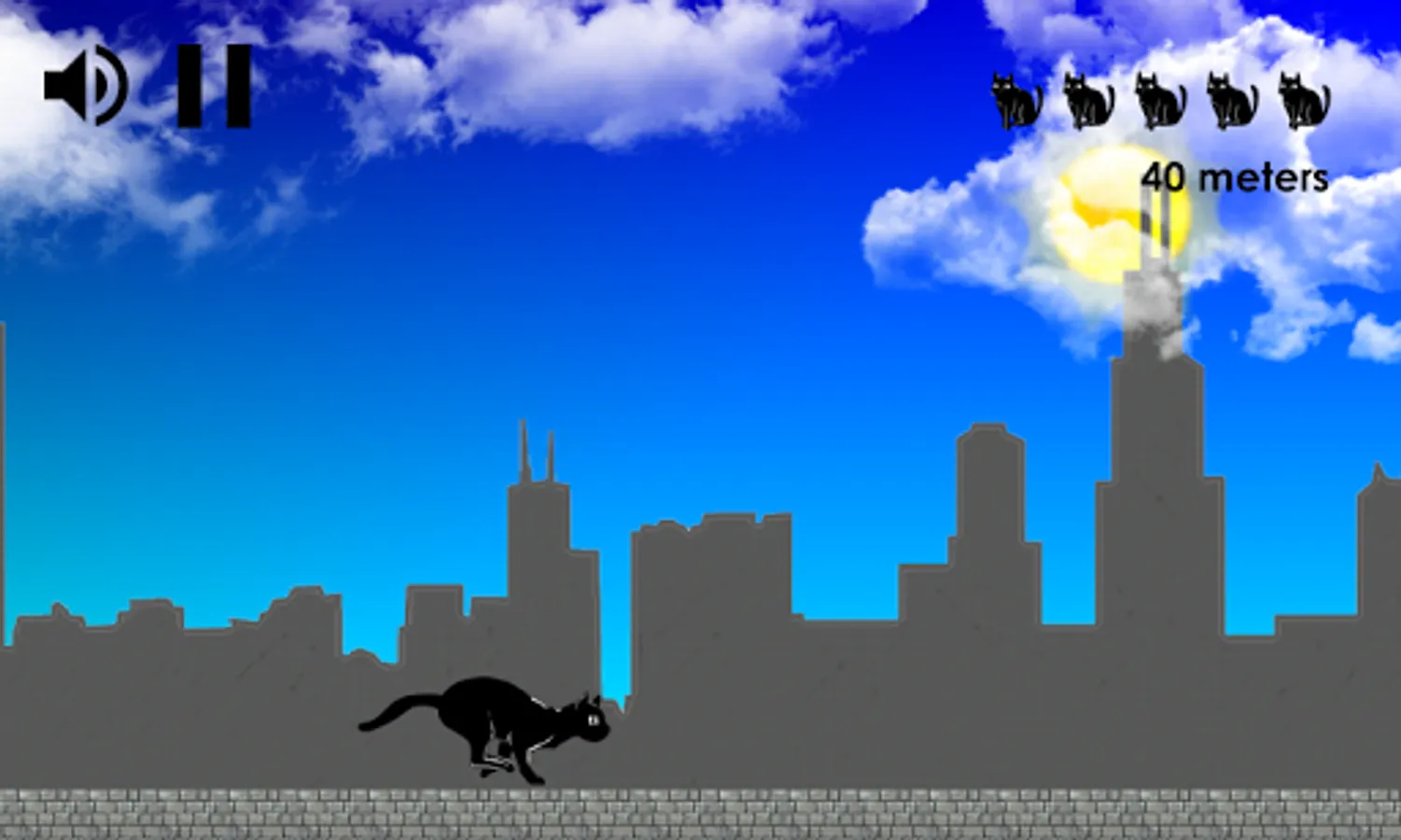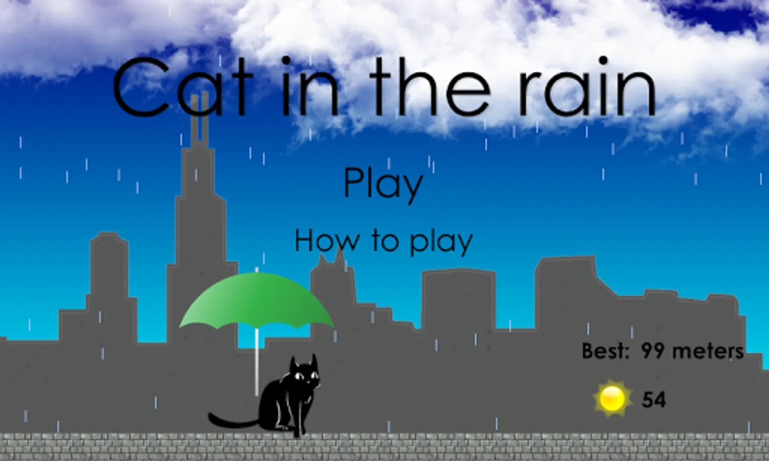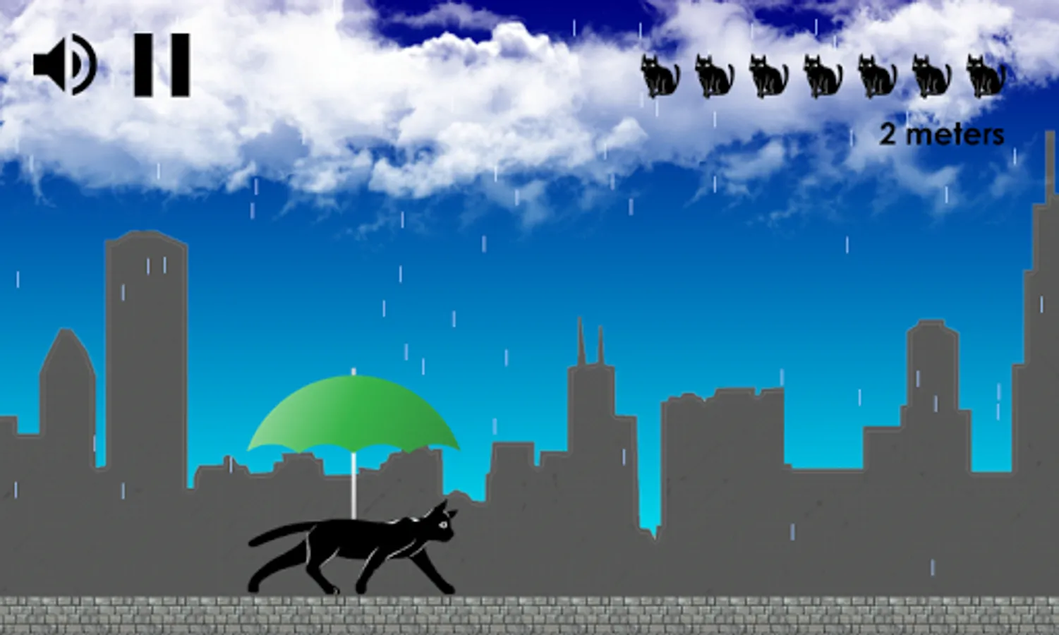 A cat walks in the rain. When the wind changes move the umbrella to avoid getting wet. Close the umbrella to run and dry up. Cover as much distance as you can to beat the highscore. If you get too wet all your seven lifes will be taken.