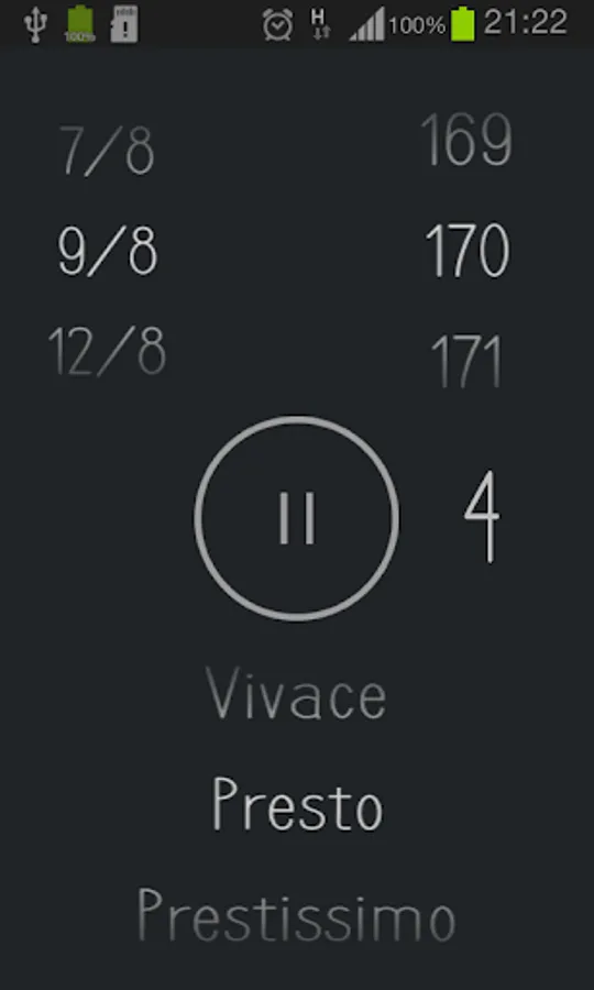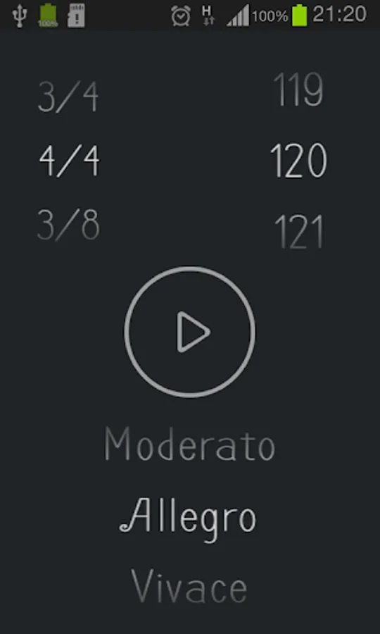 Simple metronome. Speed may be set using beats per minute (BPM) or the typical Italian vocabulary for tempo that will set the bpm automatically. A certain measure can be selected and when play is pressed the metronome will start sounding indicating the beat with sounds and displaying numbers for each beat in the measure. Speed and measure can be changed at any time without stopping the beat.