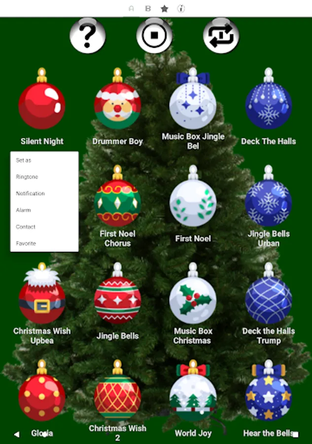 Enhance your phone's audio experience by using these high-volume Christmas melodies as ringtones, notifications, or alarms. Simply press each button to listen and preview the crystal-clear, heartwarming tunes. Want to replay your favorite song? Just hit the loop button, and the joyous sound will keep on playing. To make it even better, customize your device effortlessly by pressing and holding any button to assign the ringtone, alarm, notification, or even a specific contact. It's that easy!