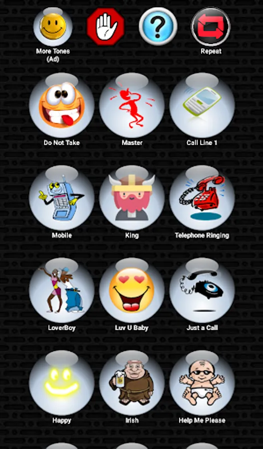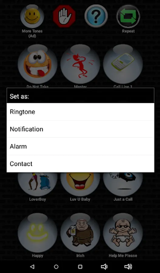 😆 Simply press each button to listen and preview the loud and clear ringtone. If you like it, press and hold the button. Then select either notification, ringtone, alarm, or contact.