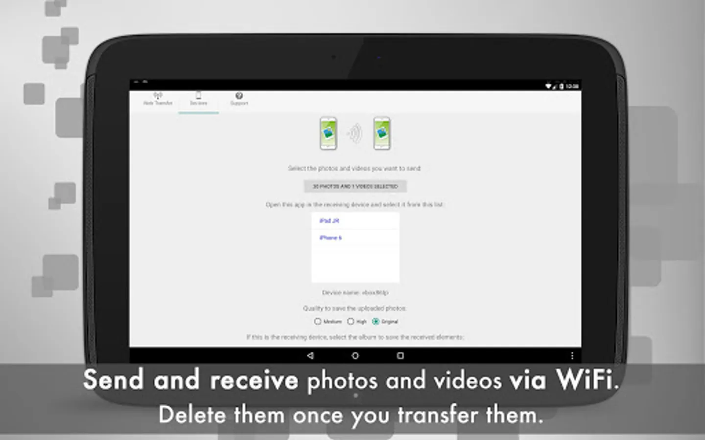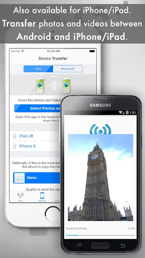• Transfer photos and videos between Android, iPhone, iPad or iPod Touch devices, using Wi-Fi.