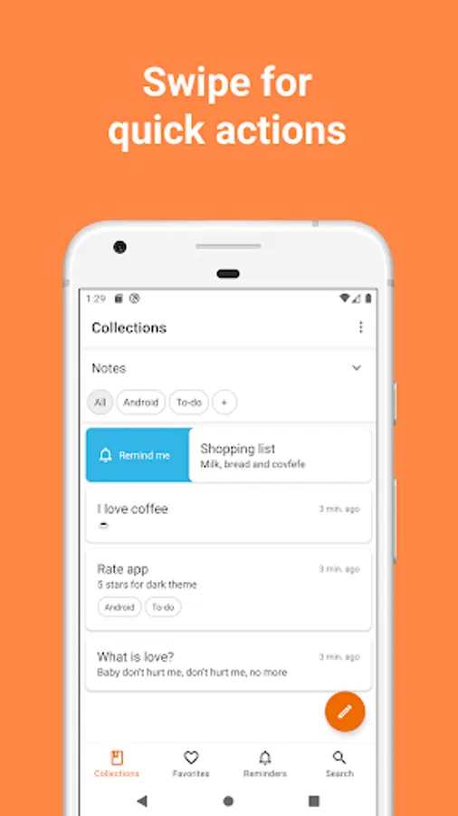 👍 Swipe notes for quick actions like settings reminders or marking the note as favorite.