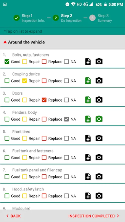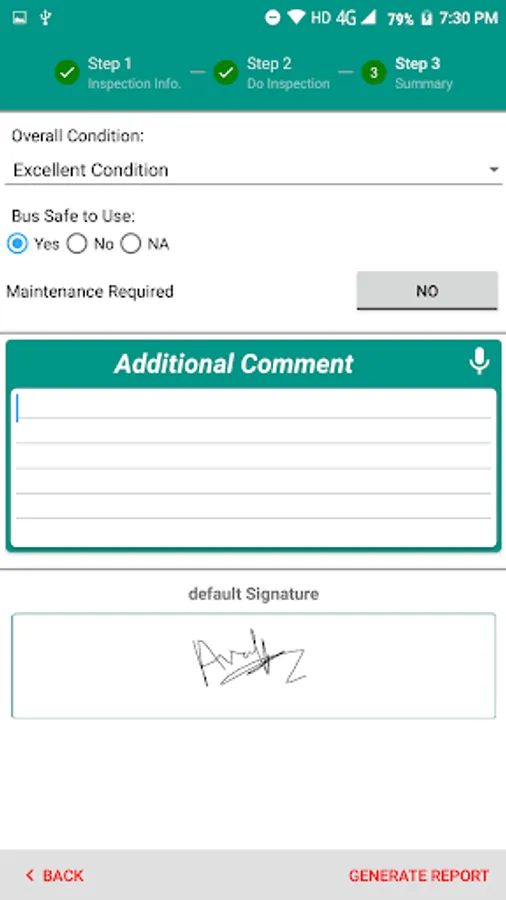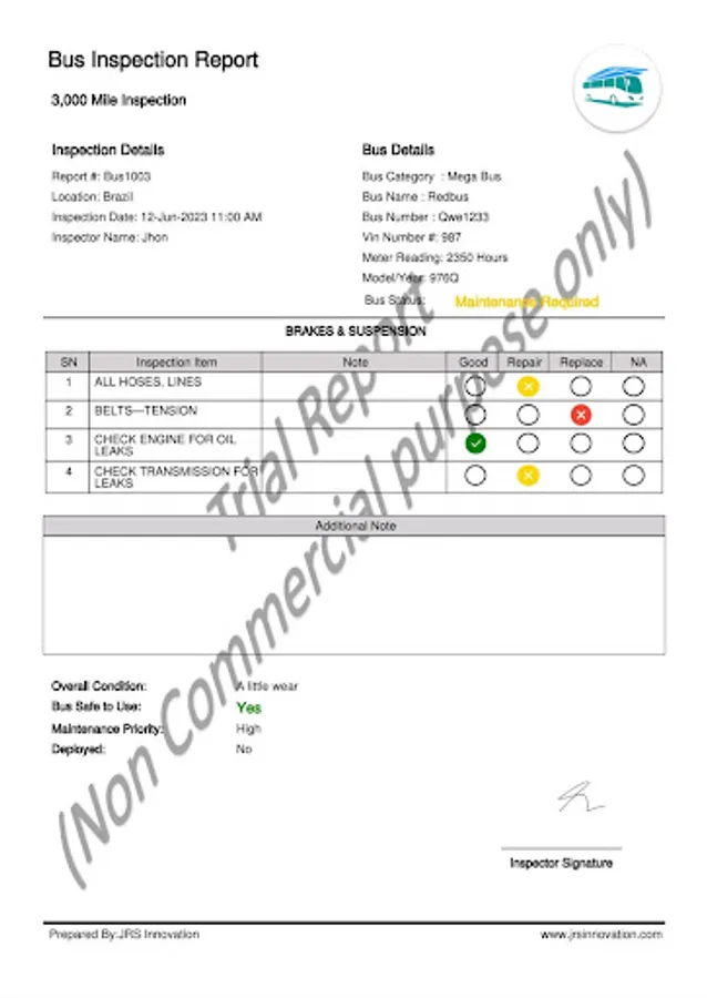 Bus Inspection PDF Report – Generate signed PDF inspection report with details on each inspection item including marking of Repair, Replace, pictures and voice Notes. Inspection items are defined in checklists.