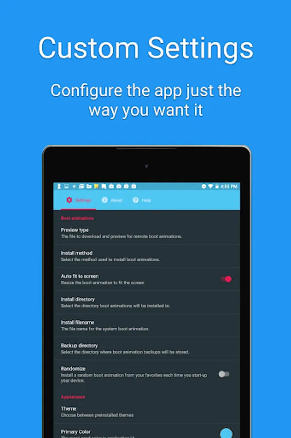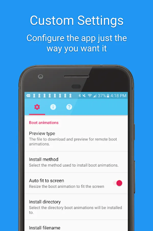 • Modify boot animations (custom dimensions, background color, frame rate).
