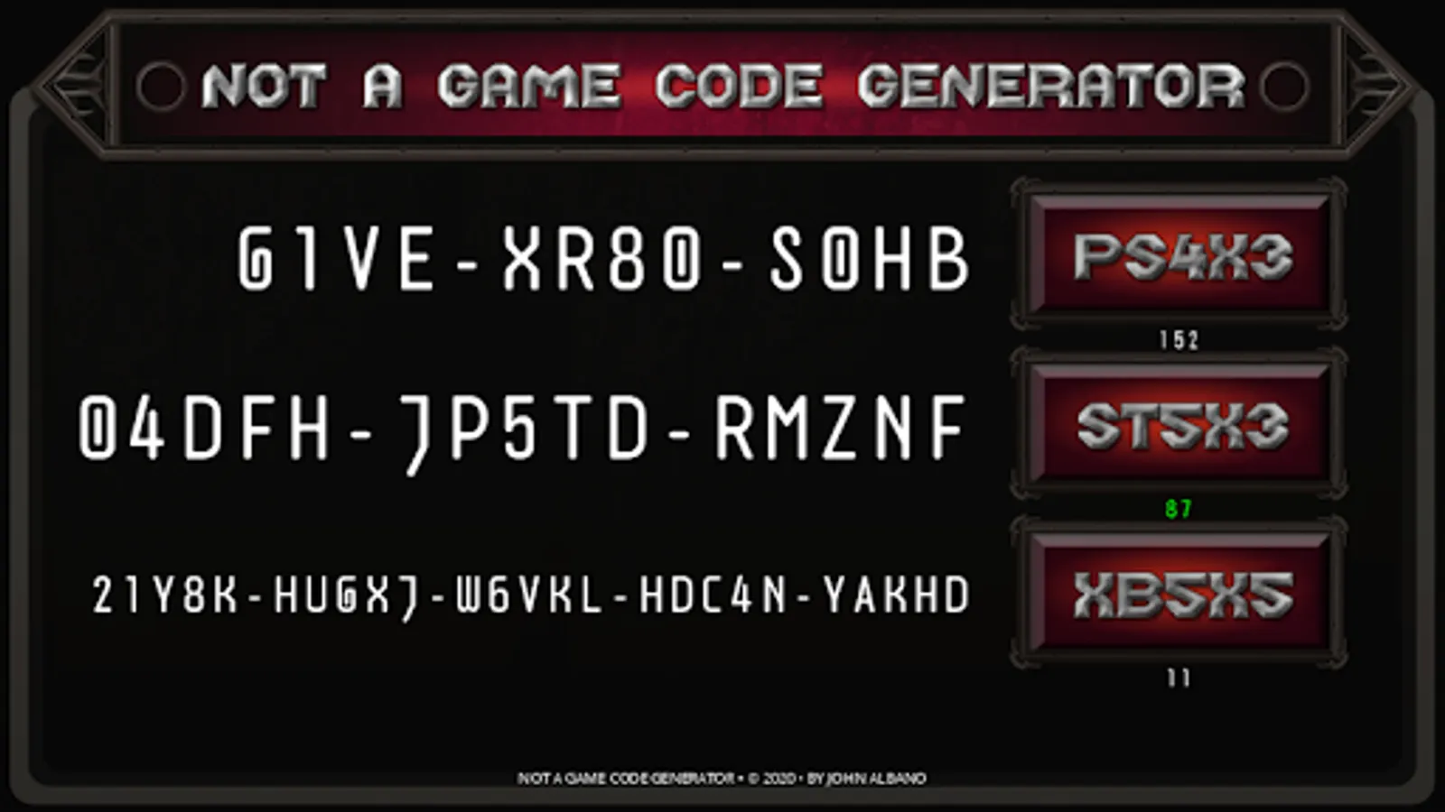Not a Game Code Generator does exactly what the name states in a quick, efficient manner. The bold output maximizes use of screen real estate to present each new result in crisp, clear text. Not a Game Code Generator uses a unique algorithm to identify successful results, providing audible notification when success criteria are met.
