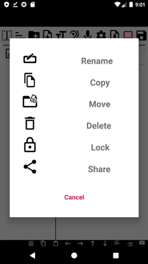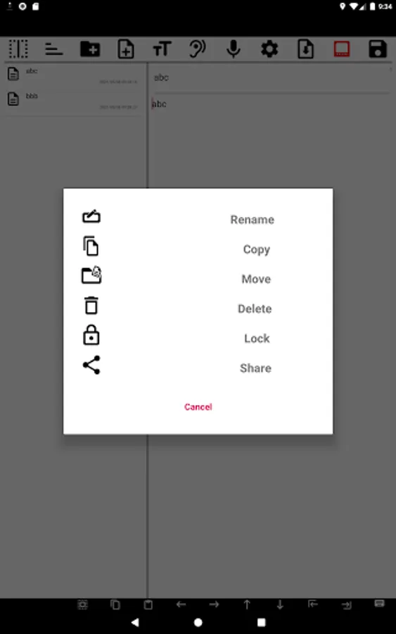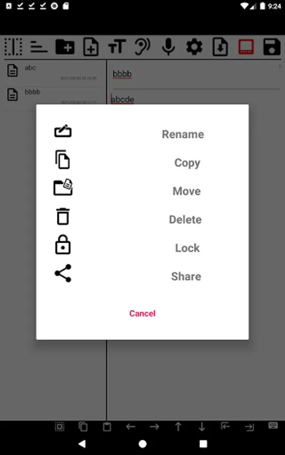 You can rename, move, copy, delete, lock files and share files by pressing and holding the list.