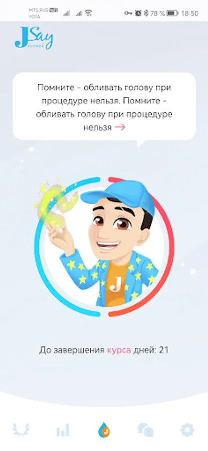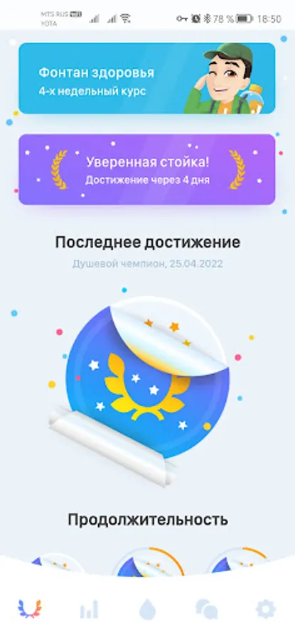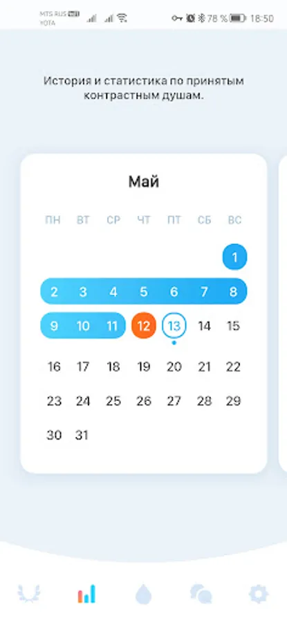 The application is designed to track and motivate the User to take a contrast shower, notifying him of the need to take a contrast shower, and allows entering data. The Application also congratulates the User if the Task is achieved and rewards the User in the form of Achievements. There is an opportunity to view the History using filters: days, months, as well as configure the Application, change User data. It is possible to write to the support chat.