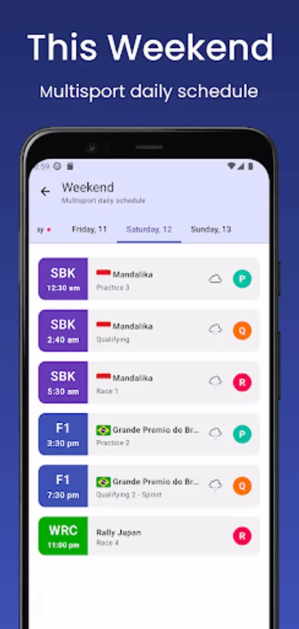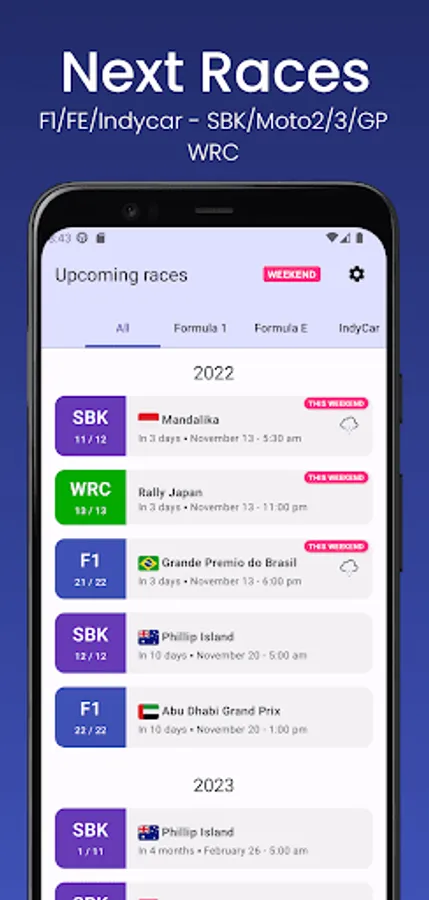 - Agenda: List upcoming races and all its scheduled events with detailed informations (date, time, tv channel, weather & more)