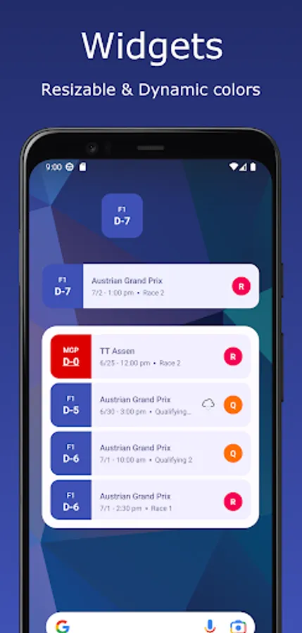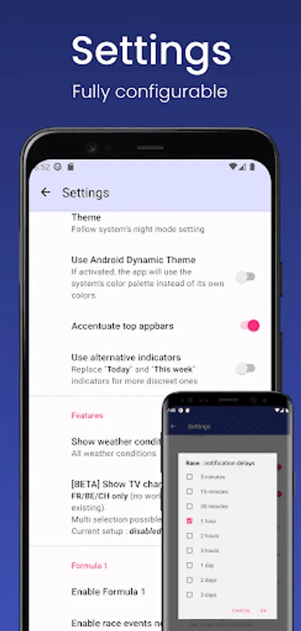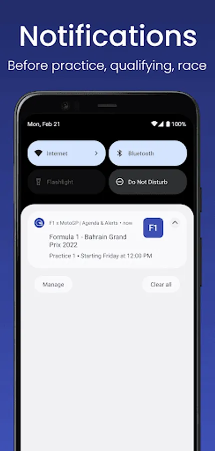 - Notifications / reminders : Get notified before any race event (Practice, Qualifying, Race)
