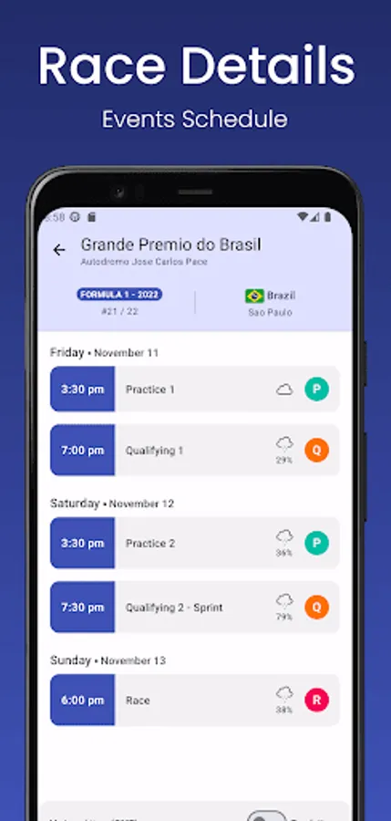 - Race details with schedule for all events (Practice, Qualifying, Race)