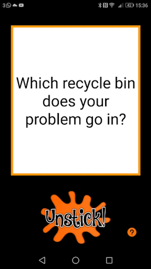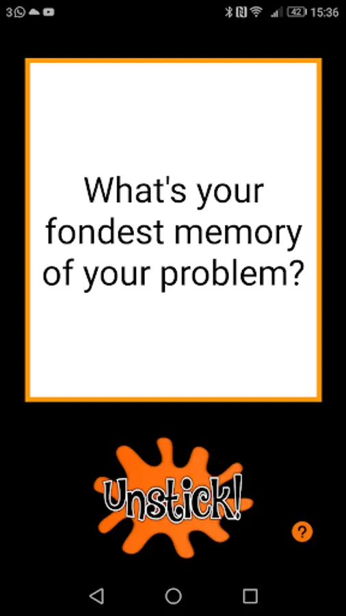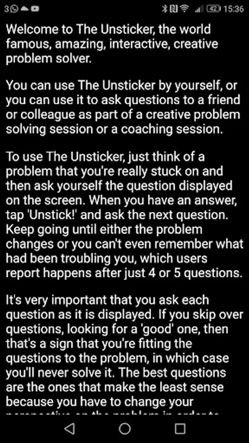 To use The Unsticker, just think of a problem that you're really stuck on and then ask yourself the question displayed on the screen. When you have an answer, tap 'Unstick!' and ask the next question. Keep going until either the problem changes or you can't even remember what had been troubling you, which users report happens after just 4 or 5 questions.