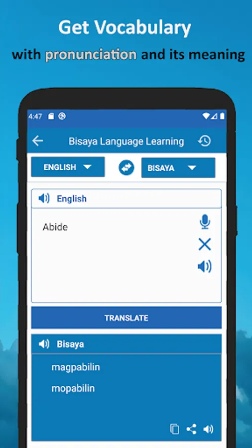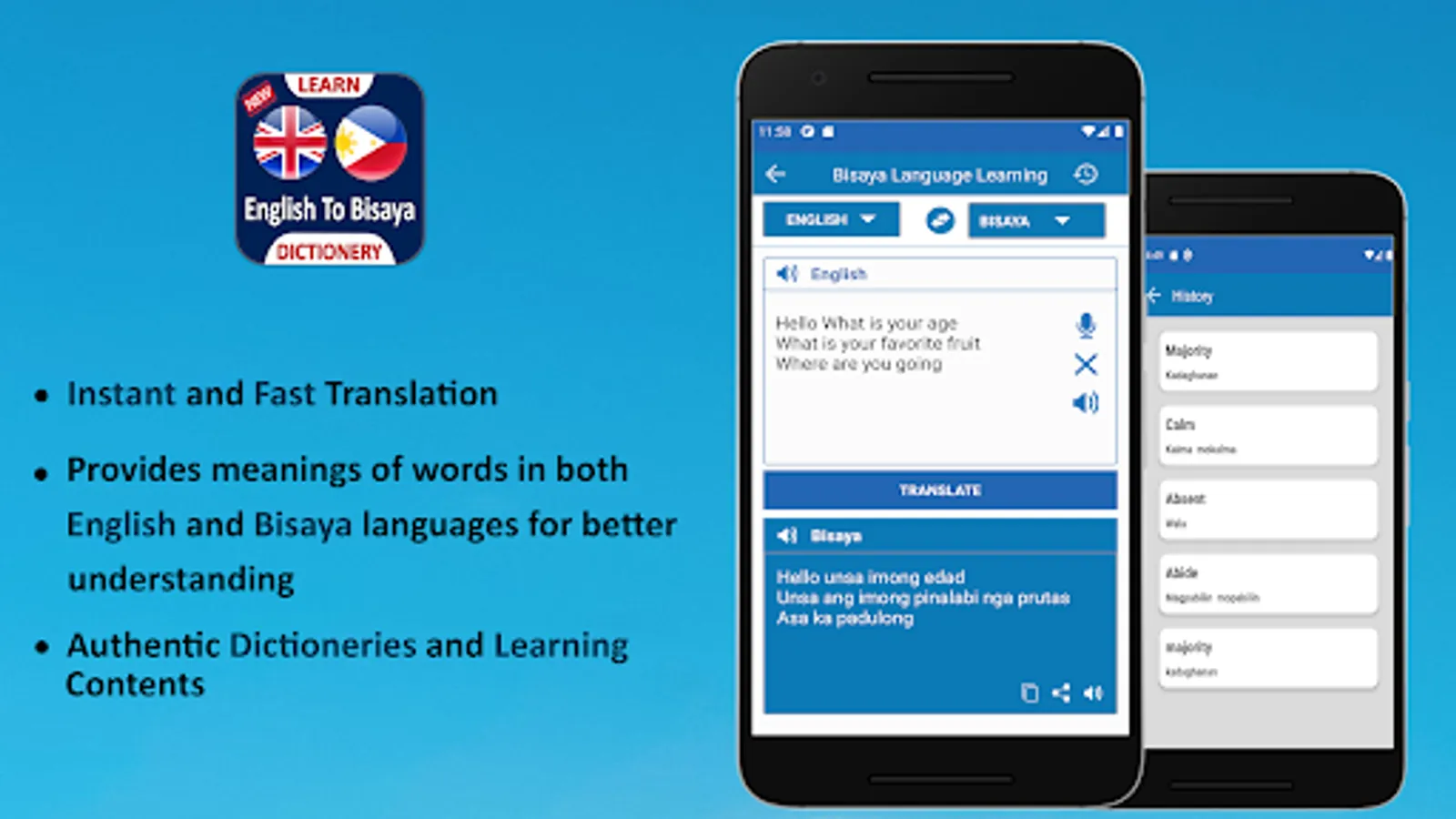 English Translate To Bisaya Dictionary learning application is made for all those who want to Learn English To Bisaya Speaking from their home without going to any institution. If you are the one who want to Learn English To Bisaya from Home, then download our Speak Bisaya To English Learning App and learn English To Bisaya & Bisaya To English from home.