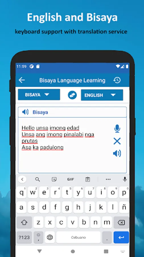 Translator From Bisaya To English language course teach: alphabet, vocabulary, grammar, travel phrases and pronunciation, etc. Bisaya To English Voice Translator will train your reading, listening, speaking and writing skills in just Few days. Self-studying a new language with English To Bisaya Translator & Bisaya To English Translator is truly efficient and effective.