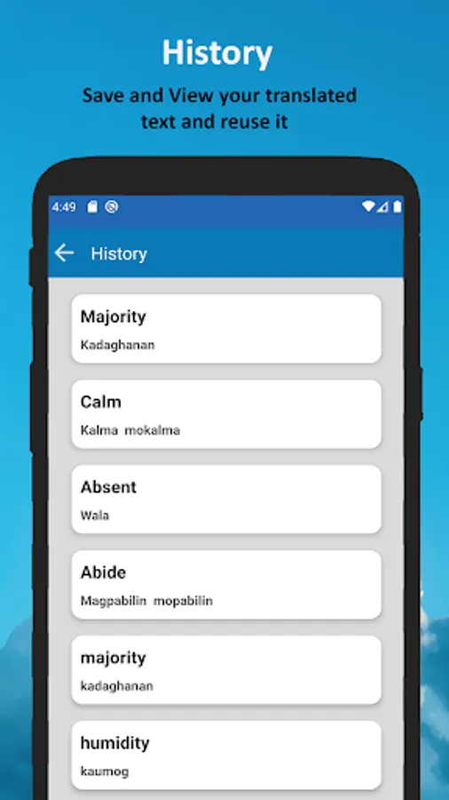 English Filipino Bisaya Dictionary is easy and great translation tool, you can translate words, phrases, and even sentences just in a second. English Bisaya Translator Dictionary is very useful in terms of daily life, traveling and other many purposes of daily life. If you go to travel, don’t forget to take English Bisaya Translator Sentence with you.