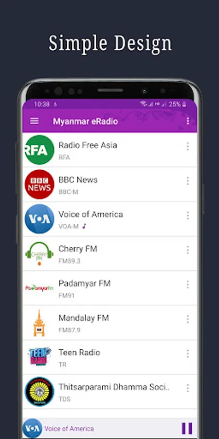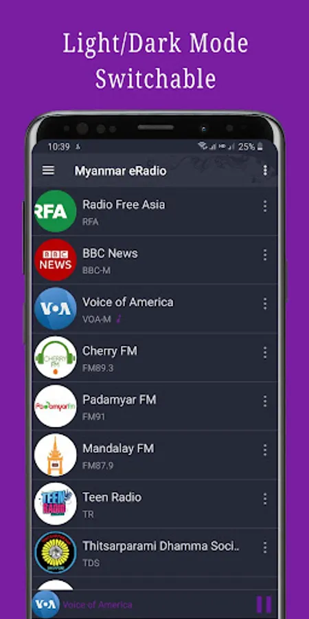 Myanmar eRadio is a free application that lets you listen to online radios in Myanmar. The app provides many radio stations both live and podcast. It is easy to use, and there is no annoyed fullscreen-advertisement.