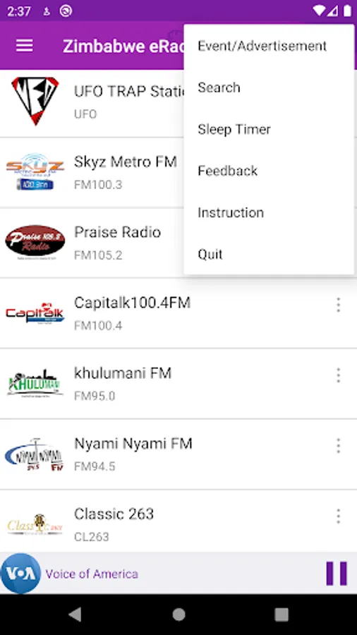 Zimbabwe eRadio is a free application that lets you listen to online radios in Zimbabwe. The app provides many radio stations both live and podcast. It is easy to use, and there is no annoyed fullscreen-advertisement.