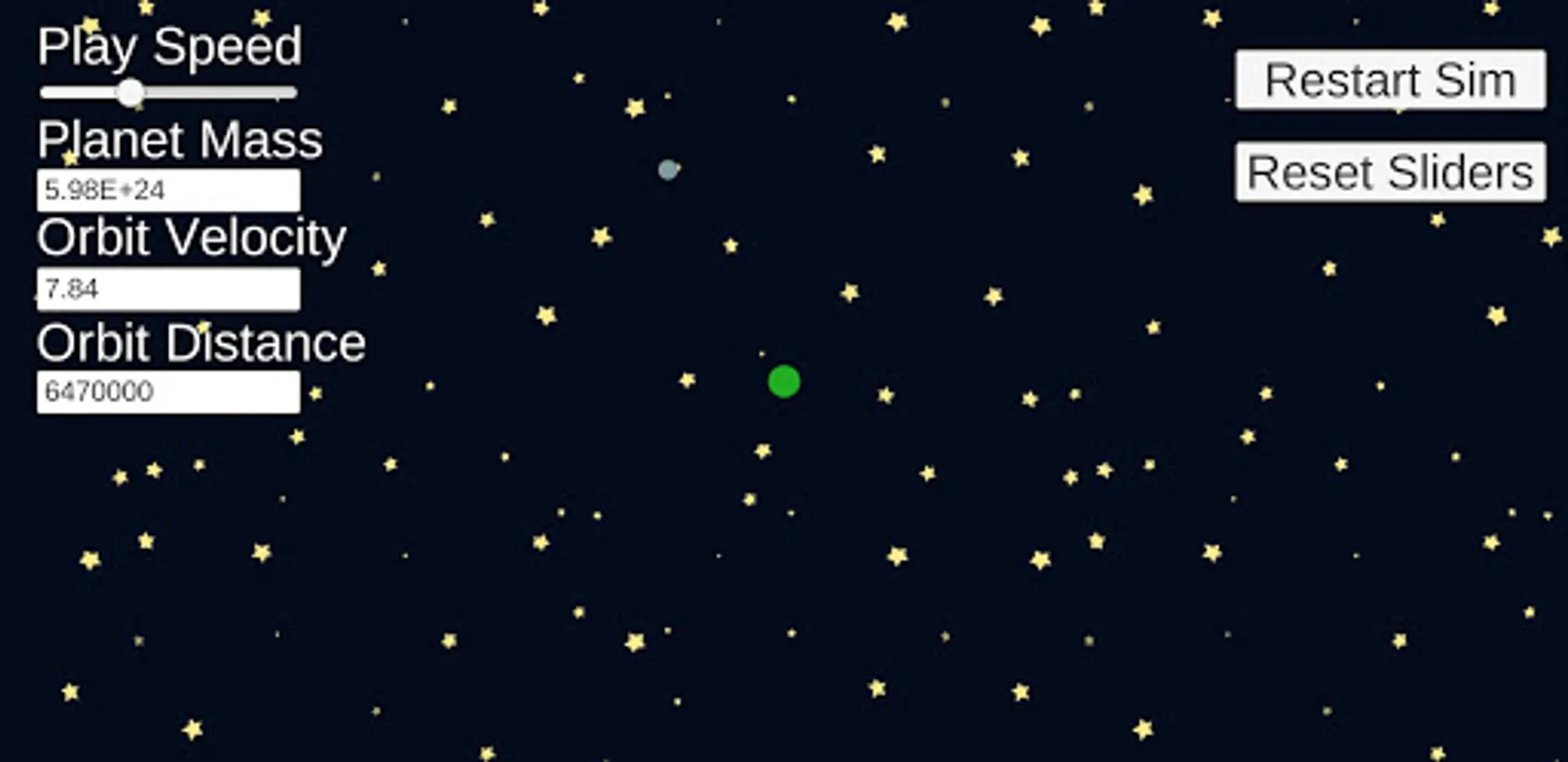 This simple app simulates the math behind planetary orbits, satellites, and gravitation scenarios. It can help build an understanding of the concept of gravitation, and what variables affect the trajectory of an object in circular motion.