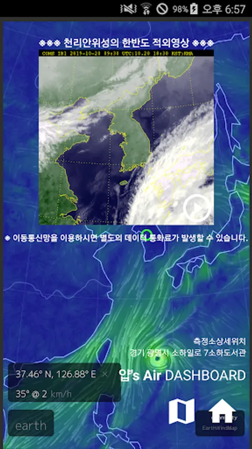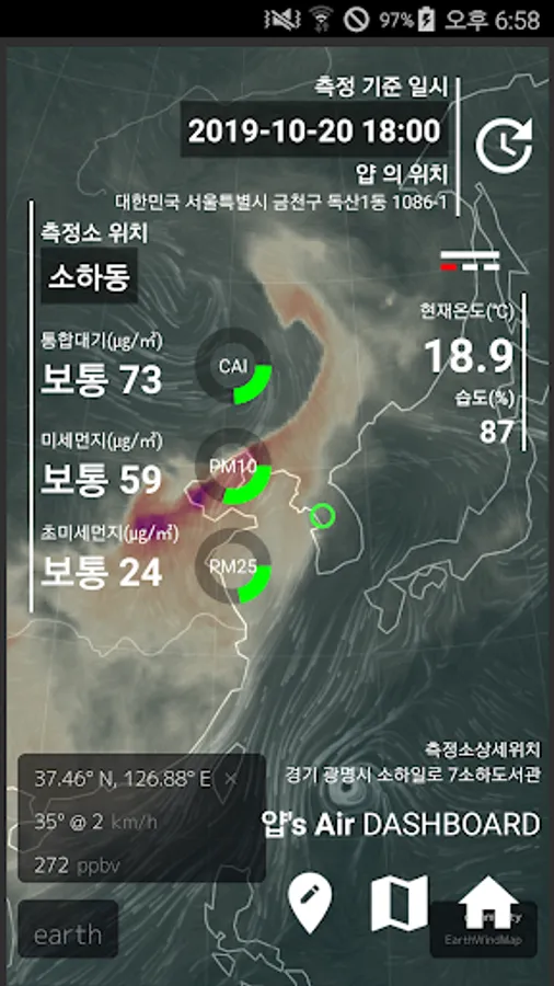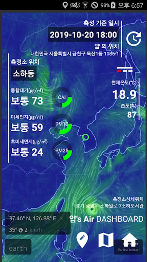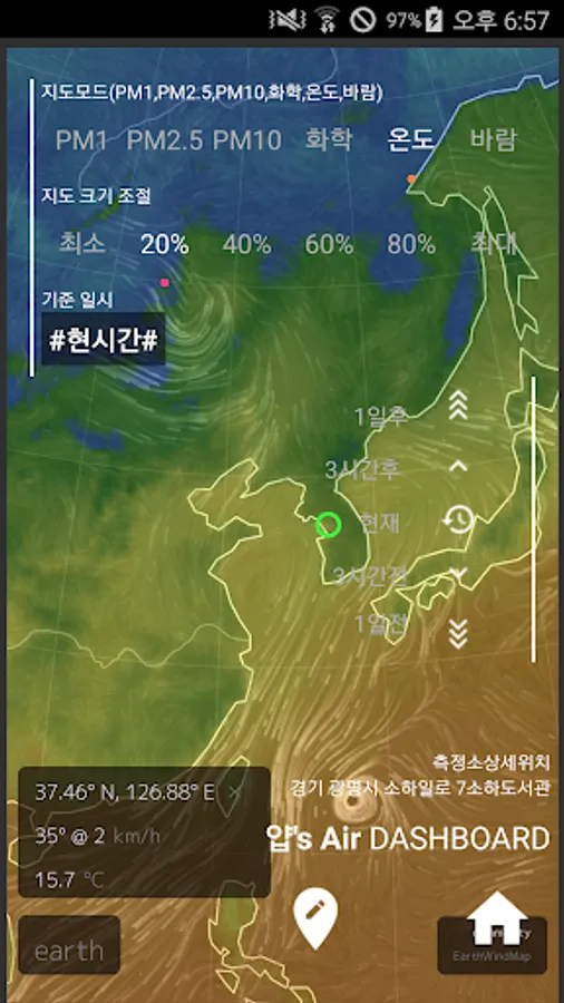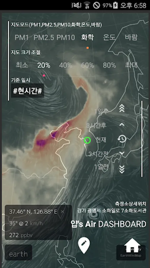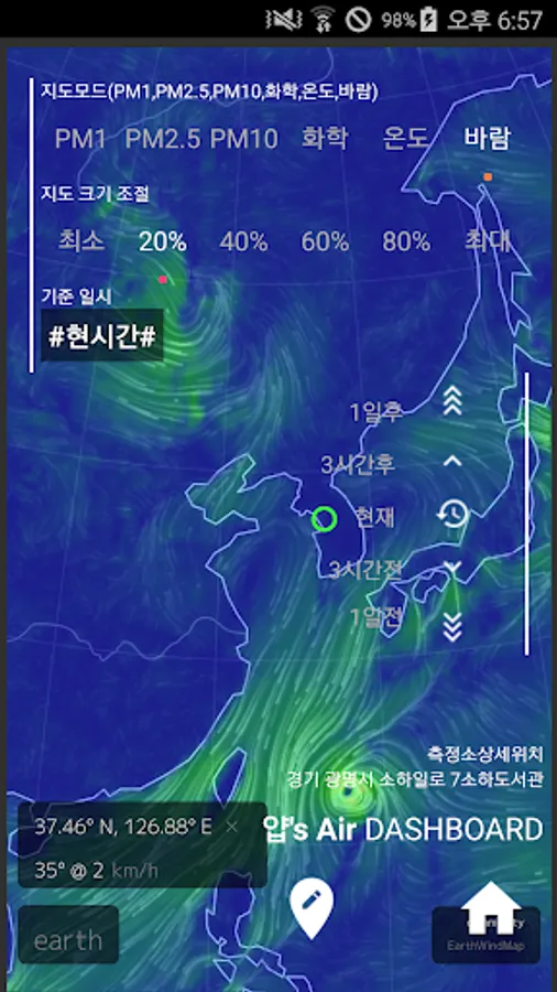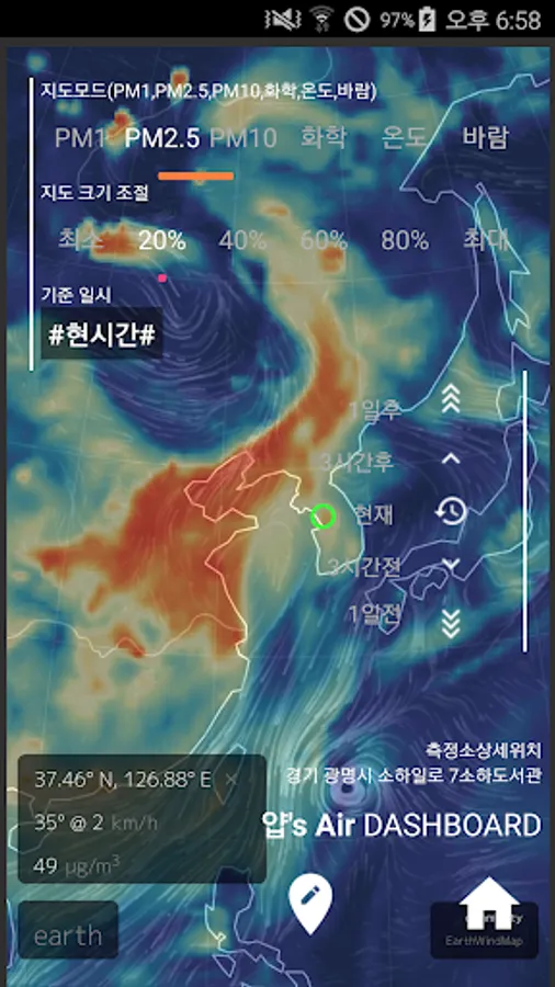 (fine dust, ultrafine dust: https://earth.nullschool.net/, updated every hour)