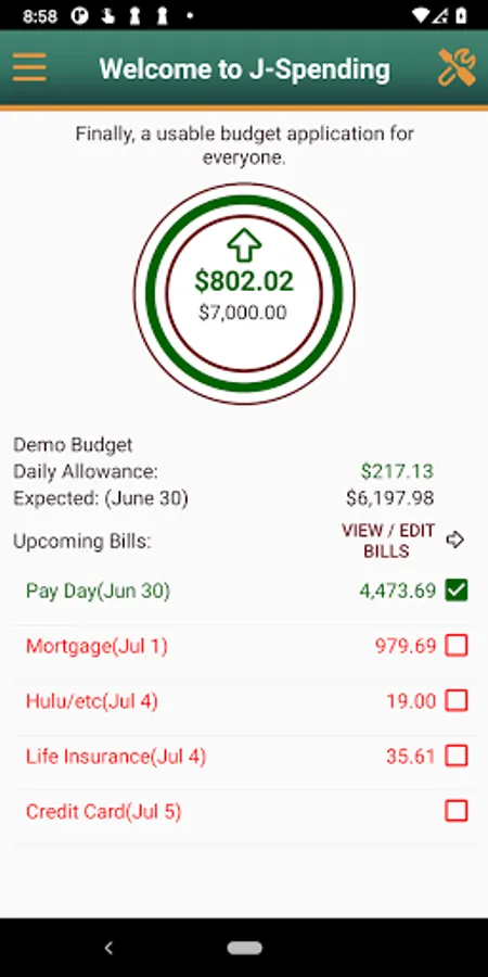 J-Spending (https://www.jspending.com) is a personal budget application based on the simple premise that what people most want out of a budget is to know how much money they can safely spend each day and still make their bills.