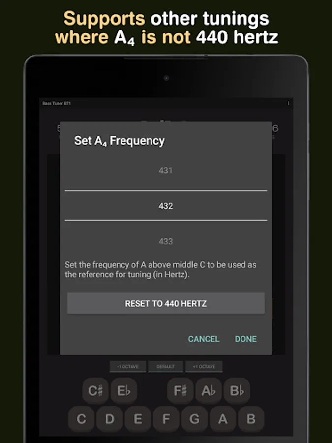 - Ability to set the frequency of A₄ (for tunings where A₄ is not 440 hertz).