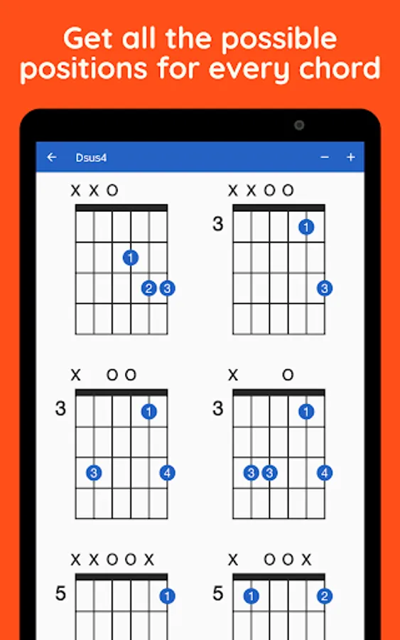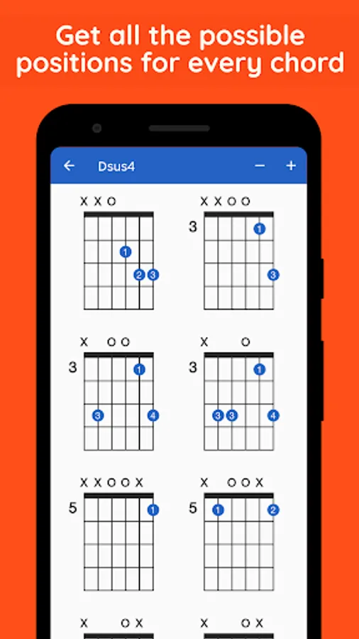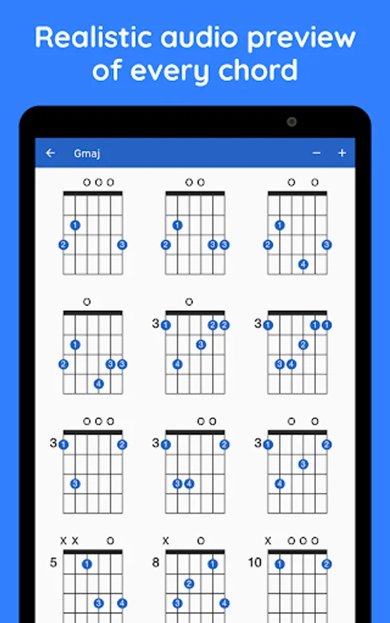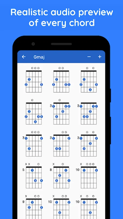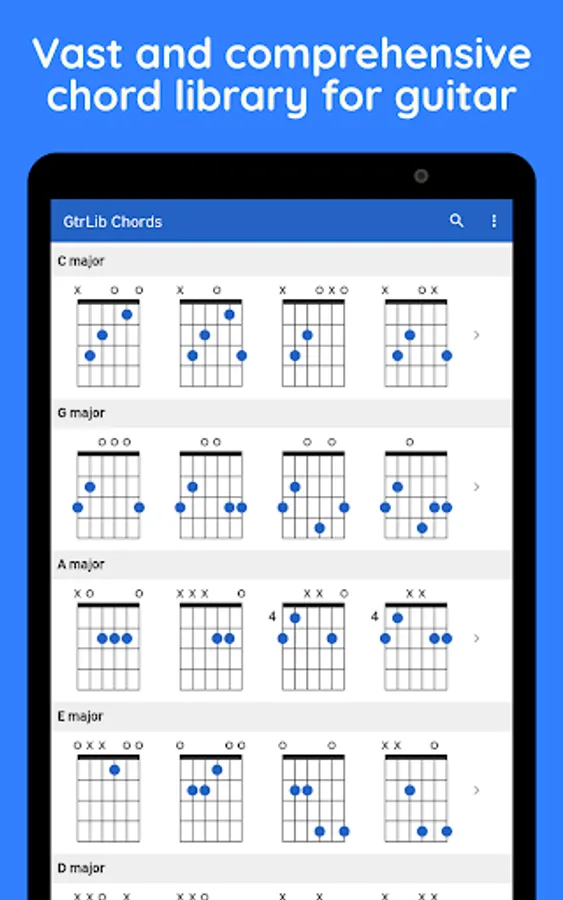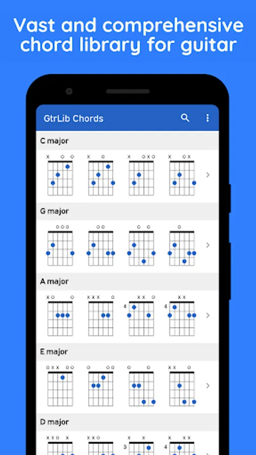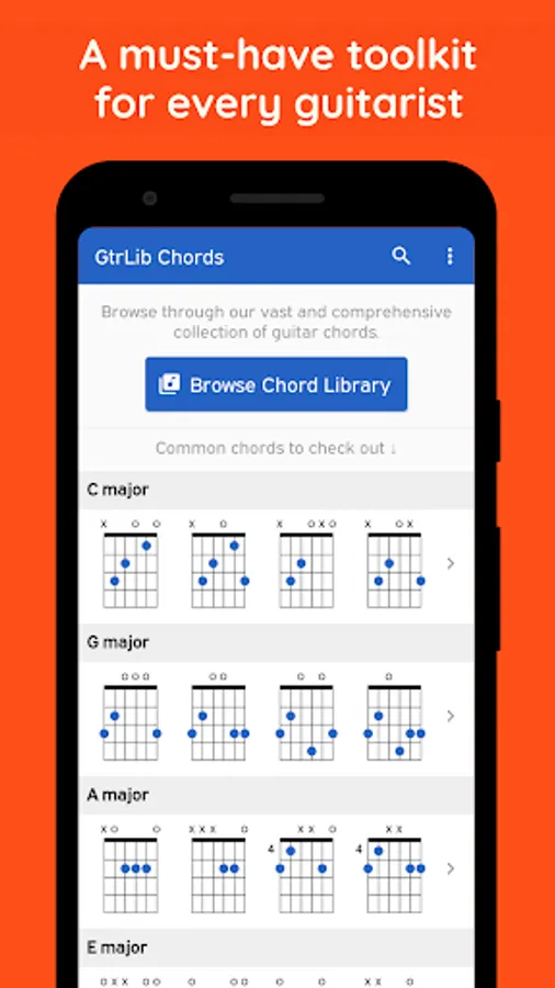 Explore the extensive collection of guitar chords with GtrLib Chords. Get guitar chord charts containing all the possible positions for any chord in the fretboard along with its suggested finger positions and realistic audio demonstration. Use the built-in search to quickly find any guitar chord. GtrLib Chords is an invaluable tool in the pocket of any guitarist.