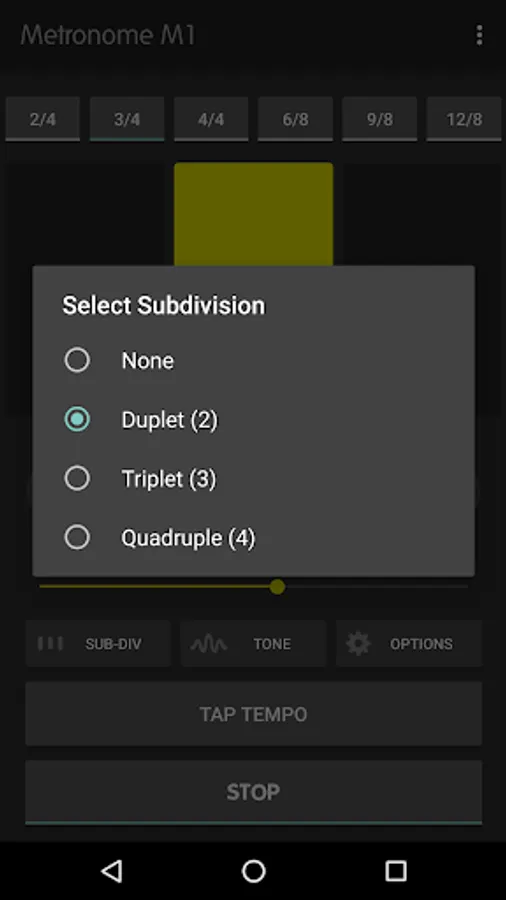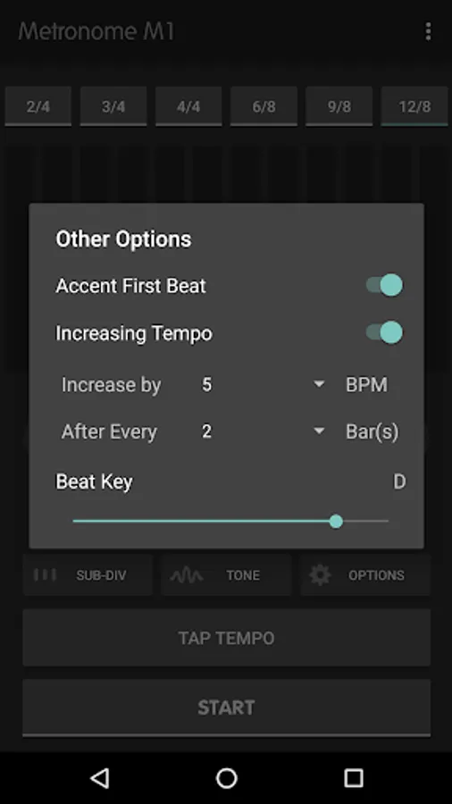 Metronome M1 also contains other features including subdivisions, option to configure beat tone and option to increase tempo progressively during practice.