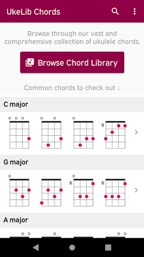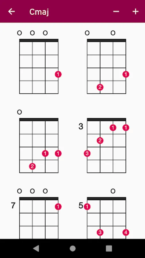 Explore the vast and comprehensive collection of ukulele chords in UkeLib Chords. Browse through ukulele chord charts containing all the possible positions of any chord along with suggested finger positions and audio demonstration of every chord position. Use the built-in search to quickly find any chord that you are looking for. Each chord is represented using beautiful vector-drawn chord diagrams. Easily share any chord with your friends or social media as a link. Whether you are just starting to play the uke or an advanced player, this app would be an invaluable tool for you.