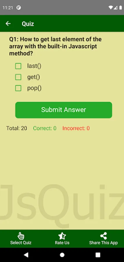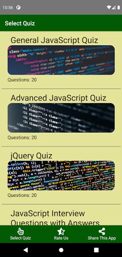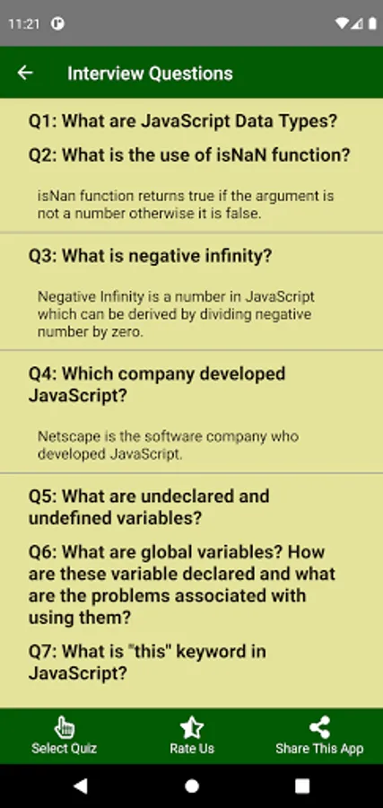 With our app you will find 60 quiz questions from beginners to advanced level of JavaScript programming. We we also included 40 interview questions focused on overall JavaScript and jQuery developer job interview