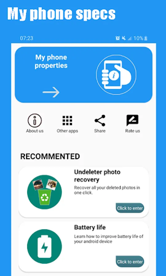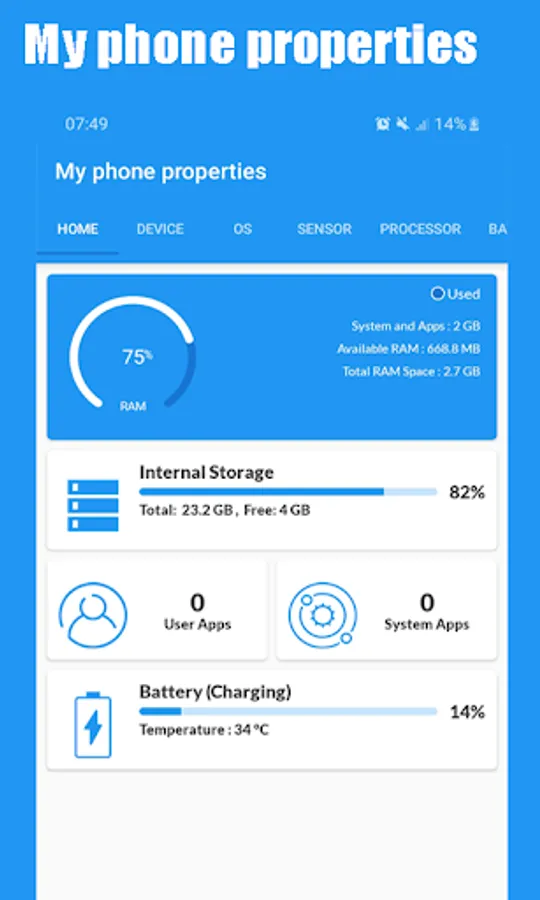 Just download my phone properties app and get to know all the specs of your android device. Android device Info includes information about Sensors, Storage,Installed Apps, System Apps, Camera, Thermal,Display, Battery, CPU, RAM, OS, SIM, Bluetooth, etc.