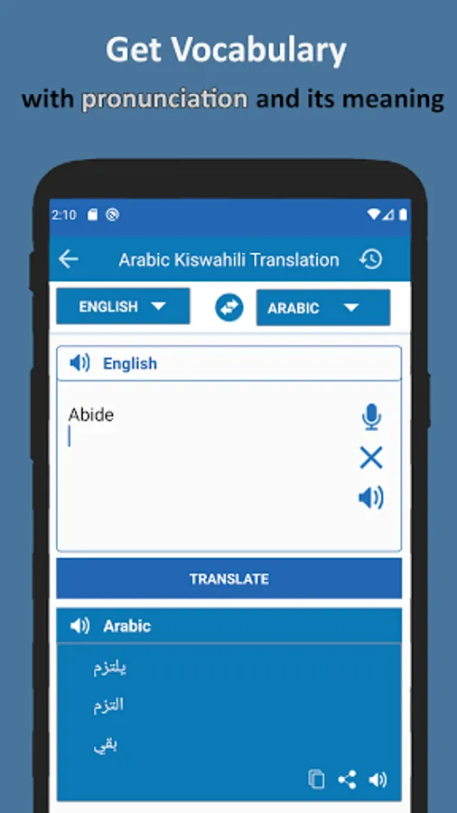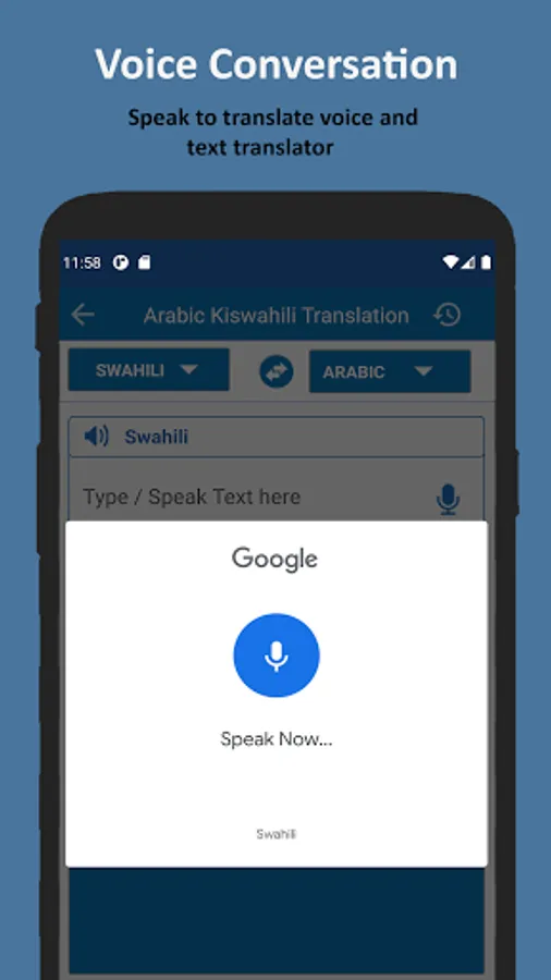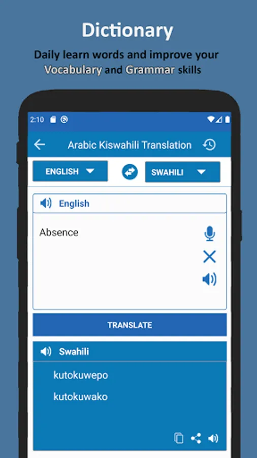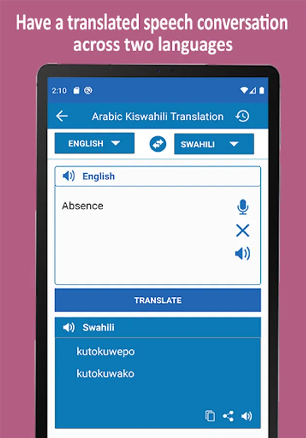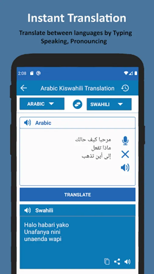 Swahili to Arabic Translator and dictionary, including speaking and translate option, makes it very easy, fast, and accurate your desired translation. If you feel difficulty in writing the text, then a Download Swahili to Arabic Dictionary and Translator brings a speak option for you to speak the sentence by clicking the microphone icon for the voice translation.