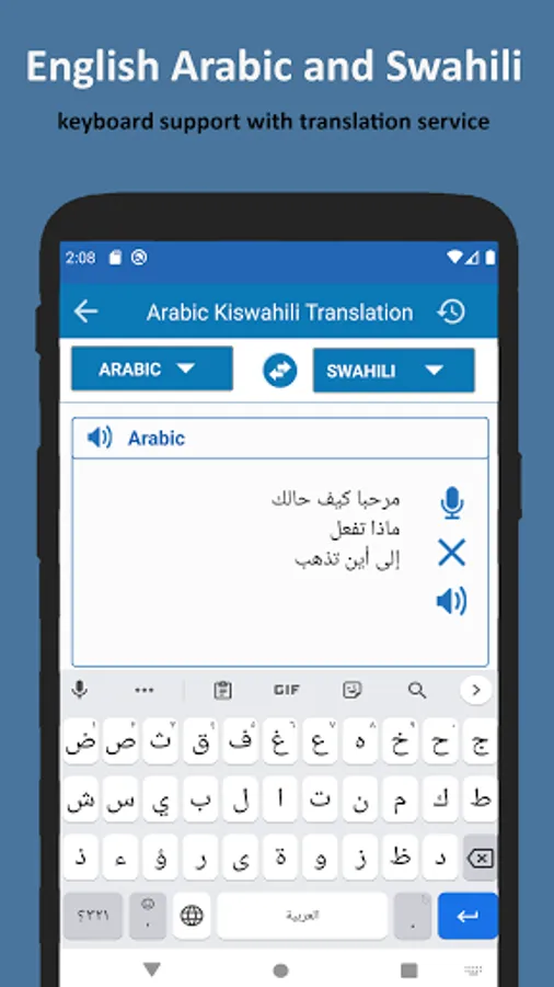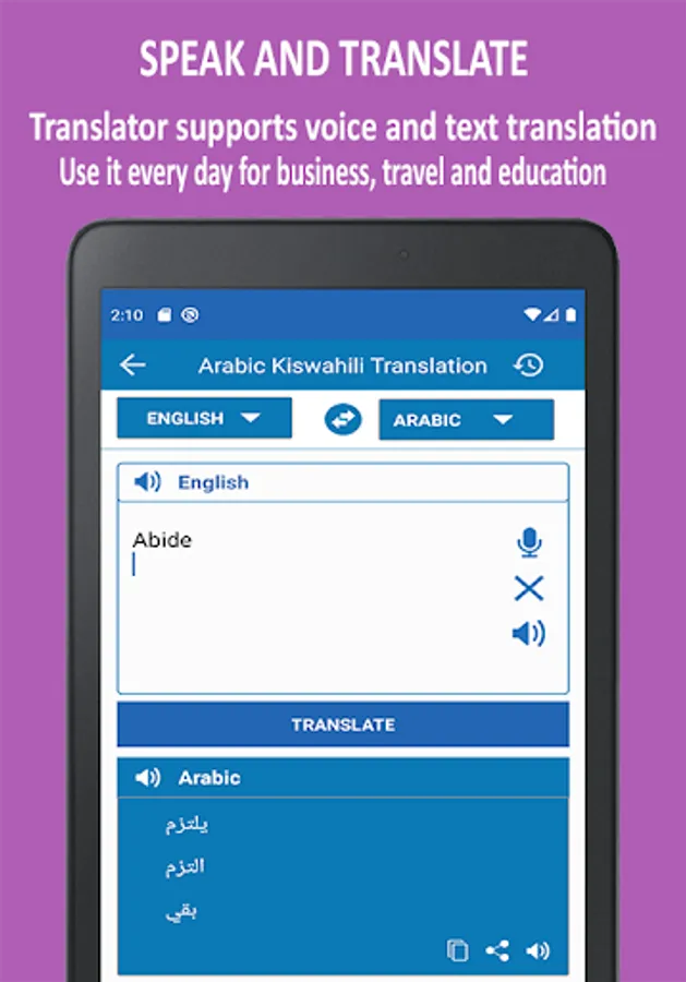 Arabic to Swahili Translator App is the most powerful translation tool on your android. Translate any sentence or phrase into any destination language, and enjoy a set of useful add-on features such as text-to-speech, and integrated social media support. English Arabic Swahili Dictionary is a beneficial app, so it is going to be your assistant translator and dictionary when you travel or for other purposes.