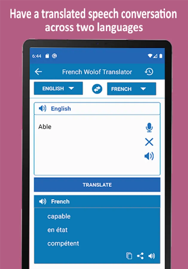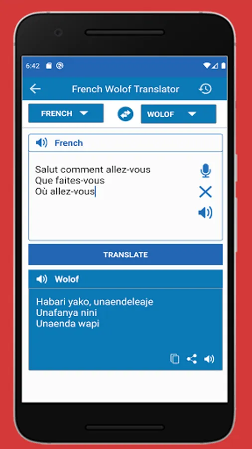French to Wolof Translator App is completely free for all the users. You can translate whole paragraph French to Wolof language. Wolof French Translator application is best to translate texts very fast in your cell phone or tablet.