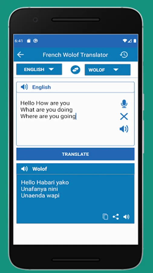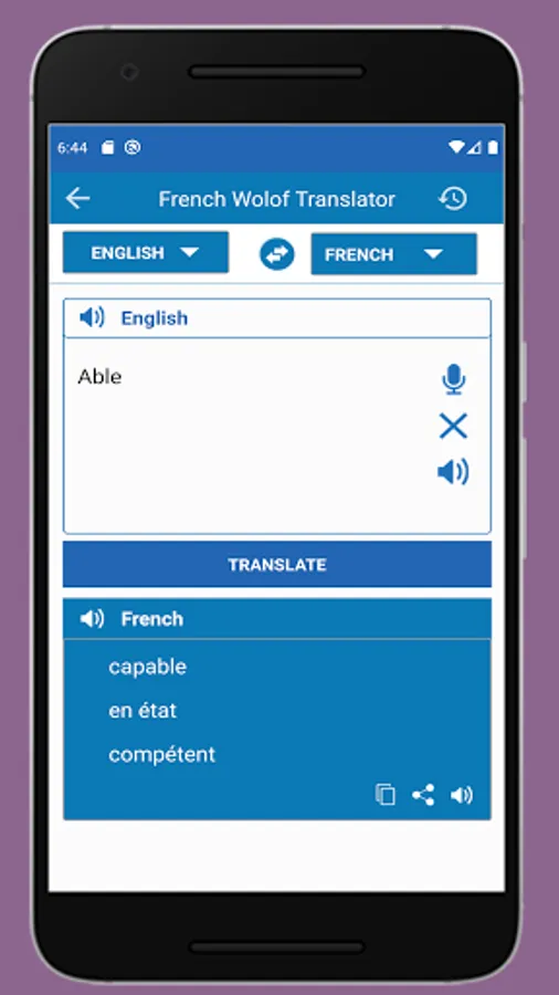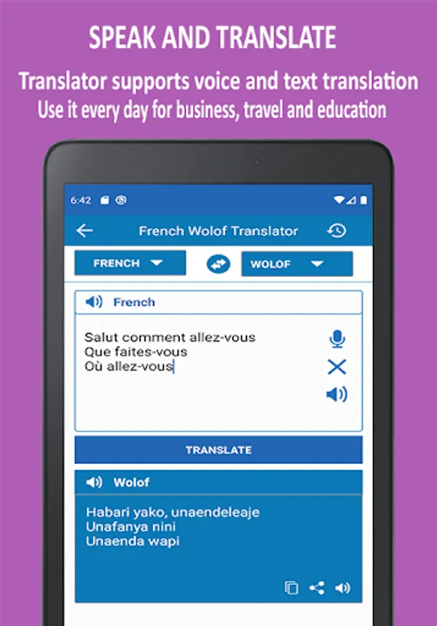 Wolof French Translator and dictionary, including speaking and translate option, makes it very easy, fast, and accurate your desired translation. If you feel difficulty in writing the text, then a to Wolof French Translator and dictionary brings a speak option for you to speak the sentence by clicking the microphone icon for the voice translation.