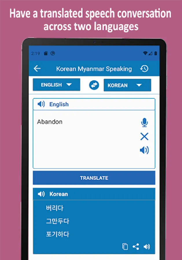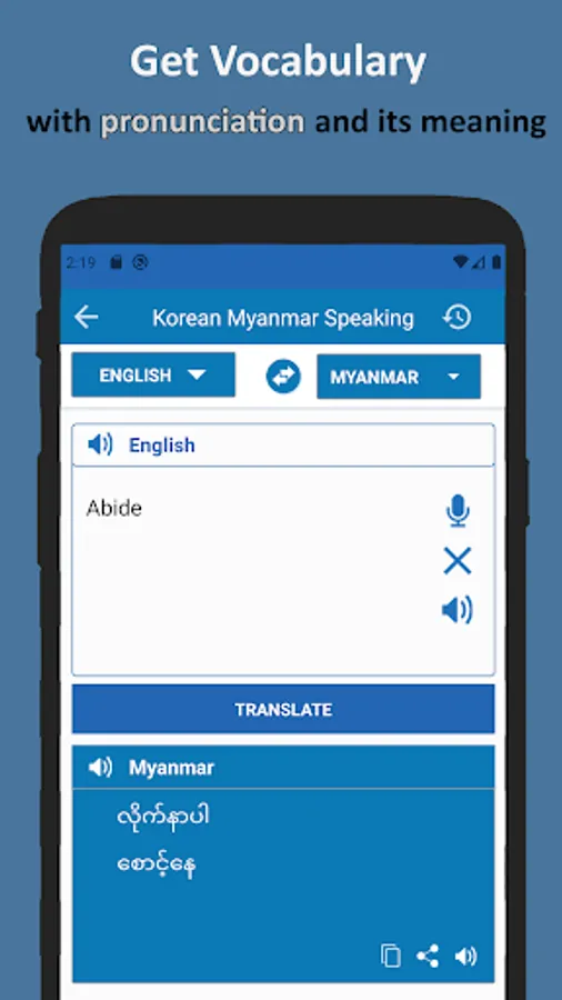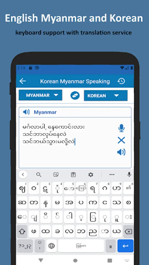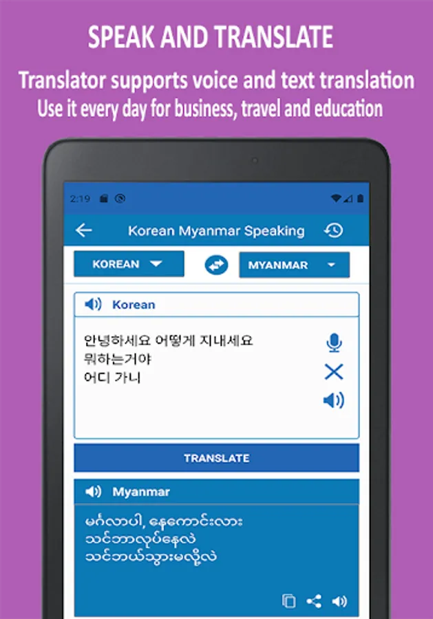 Korean Language to Myanmar translator and dictionary, including speaking and translate option, makes it very easy, fast, and accurate your desired translation. If you feel difficulty in writing the text, then a Korean and Myanmar Speaking translator and dictionary brings a speak option for you to speak the sentence by clicking the microphone icon for the voice translation.